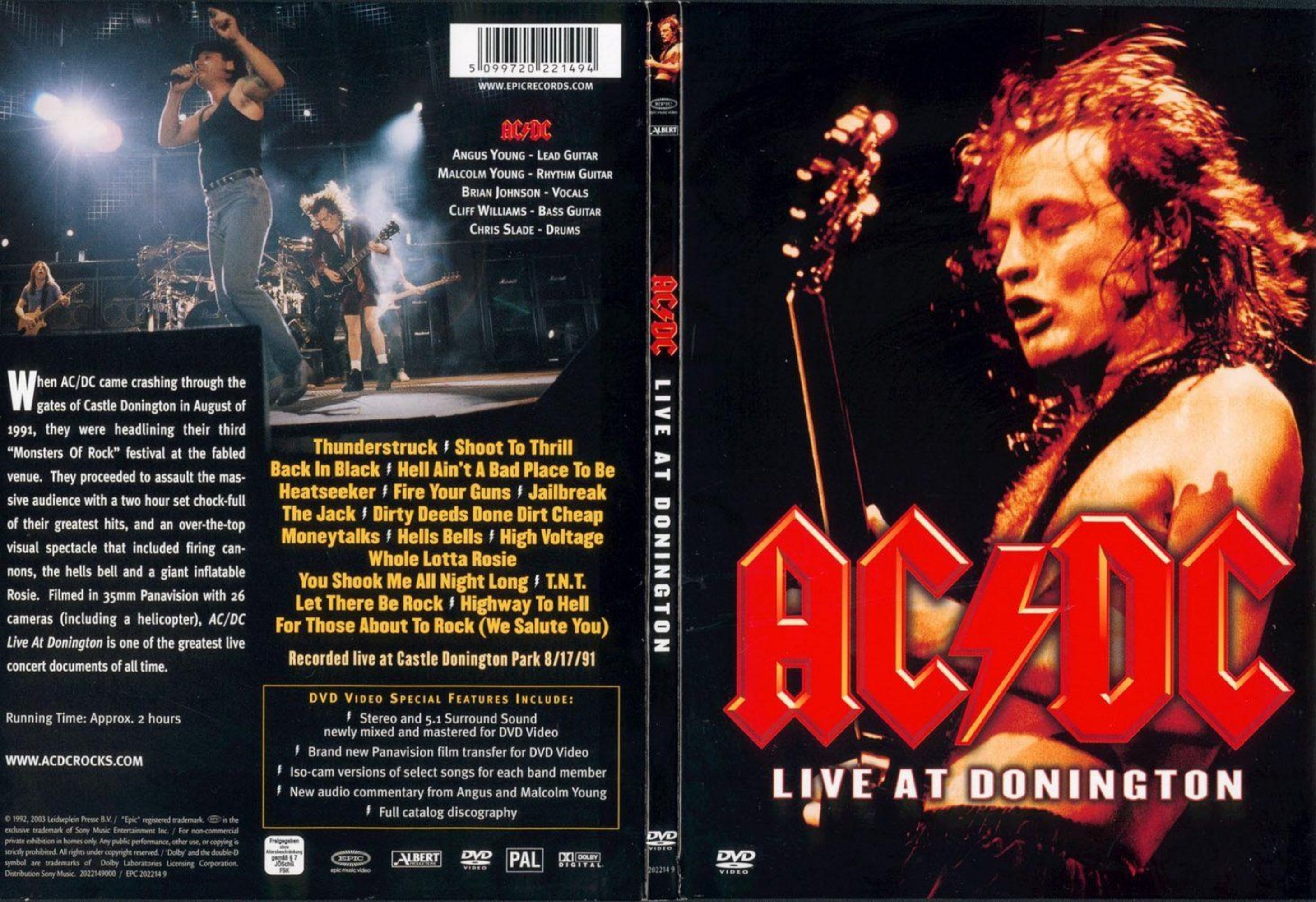 Label : Epic Music Video Venue : Monsters of Rock Festival, Donington Park, Castle Donington, England Recording Date : August 17, 1991 Release Date : 2003 Length : 120 minutes NTSC : 16:9 Review (AllMusic) : Taken from their Razor's Edge world tour and filmed in 1991, Live at Donington is the best video AC/DC has yet to offer. Yes, fans will be pleased to know that all the classics are here, from "Dirty Deeds Done Dirt Cheap" to "Jailbreak." The band really plays well, and singer Brian Johnson contributes to keeping the show interesting with his vocals and actions. Probably the best thing about Live at Donington is that it, like its album release, it's packed with thrice as much energy than the band ever placed on their original studio cuts. Live at Donington is a video that AC/DC fans should be interested in, especially if they have never seen or heard the band perform live. Review (Wikipedia) : Live at Donington is the DVD recording of the Australian rock band AC/DC‘s show at Donington Park on 17 August 1991, directed by David Mallet; it was the band's third Monsters of Rock festival. The two-hour show was performed before 72,500 spectators and included real cannons, the Hells Bell, an inflatable Rosie and two inflatable Anguses: one to the right of the stage, and one in the back of the stage during Hell Ain't a Bad Place to Be. It was filmed in 35 mm Panavision and had 26 cameras that included one situated inside a helicopter. The DVD includes special features such as stereo and 5.1 surround sound, Iso-cam versions of certain songs for different band members, and audio commentary from Angus and Malcolm Young. Another option allows the viewer to focus on just one member for the length of a song. This option is available for Angus Young on "Thunderstruck", "Back in Black", and "Highway to Hell". The option is offered for Malcolm Young on "T.N.T.", Brian Johnson on "Whole Lotta Rosie" and Cliff Williams on "Dirty Deeds Done Dirt Cheap". For unknown reasons, this option was not available for Chris Slade. One other feature is a full catalogue discography with audio interview of all international albums. Despite the commercial success of the DVD, many hardcore fans were disappointed that the audio was ‘fixed’ with various overdubs, resulting in many differences from the original audio, although the DVD officially released in Brazil used the original audio. The tracks from Live at Donington on AC/DC Live use the original audio. |