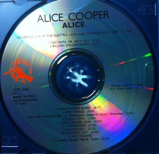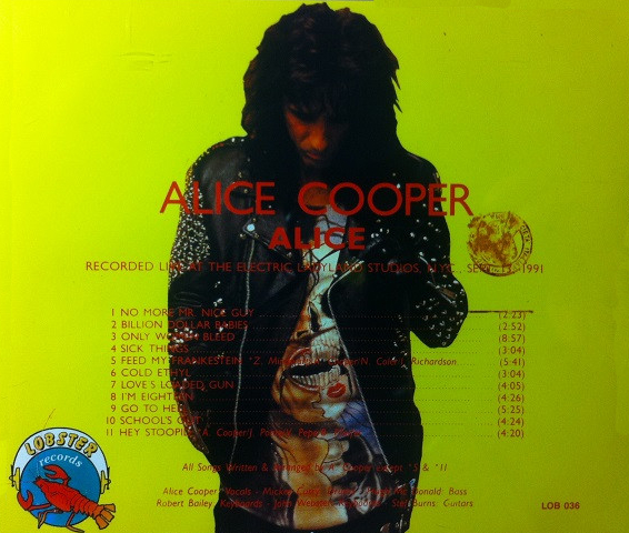 Label : Lobster Records Venue : Electric Ladyland Studios, New York City, New York, USA Recording Date : September 13, 1991 Length : 48:42 Quality : FM Recording (A+) Review : In 1991, Alice Cooper recorded a live radio show broadcast for WNEW-FM, titled "Live from Electric Ladyland" or "Nightmare on Your Street," at Electric Ladyland Studios in New York. The session, which took place on September 13, 1991, featured songs like "No More Mr. Nice Guy" and "Hey Stoopid" with musicians Stef Burns and Eric Singer, and was broadcast on October 31, 1991. This is a nice bootleg of that broadcast recording. |