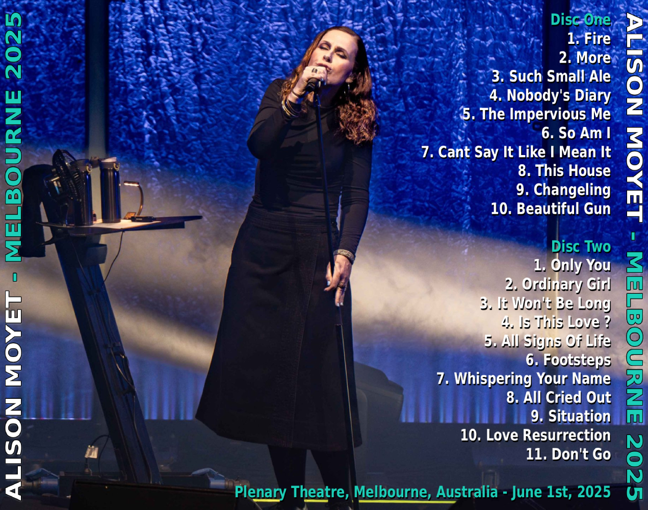 Label : no label Venue : Plenary Theatre, Melbourne Convention & Exhibition Centre, Melbourne, Australia Recording Date : June 1, 2025 Quality : IEM Recording (A+) Review : Full show in glorious stereo Hifi IEM recording quality. The Plenary is a magnificent venue with amazing sound. This recording has a perfect sound balance with strong vocals from Alison and the audience was mic'd up in stereo in the feed which is a nice. Lots of talking between songs and stories which is also nice. The audience gets very quiet in places but gets off their seats at the end. Hurrah! Concert Review (Beyond The Encore) : Forty years into a solo career that’s weathered trends, reinventions, and the fickle tastes of pop culture, Alison Moyet walks on stage with the kind of quiet command that doesn't need to announce itself. At Melbourne’s The Plenary, the KEY Live Tour felt less like a retrospective and more like a recalibration—of legacy, voice, and presence. Three individual stages spanned the majority of the stage, Moyet at the centre with guitarist Brendan Cox and musical director Sean McGhee on either side. The set-up was deliberate and clean, giving the music space to breathe while reminding the audience where the focus belonged. This wasn’t a show built on spectacle; it was built on substance. Moyet has never taken the easy path. Her voice—deep, soulful, and shaped beautifully by time—is unmistakable, but what hit hardest in this show was how present she was in every single note. Nothing was phoned in. This wasn’t just a roll-out of hits. It was a journey through the emotional and sonic terrain she’s mapped over the past forty years—rich, unpredictable, and completely her own. And what a journey. The set was rich with contrast: the icy minimalism of “The Impervious Me” sat alongside the aching vulnerability of “This House,” the latter carrying a kind of emotional gravity that was almost hard to sit with. It wasn’t theatrical, it was human. Raw. Moyet didn’t ask for sympathy, she simply told the truth. That’s always been her gift—cutting through with a directness that doesn’t beg for attention, but holds it firmly. There were nods to Yazoo, of course, but they didn’t feel like nostalgia plays. “Nobody’s Diary” and “Only You” were threaded through the set with care, reshaped ever so slightly, as if to remind us these songs aren’t museum pieces—they’re still breathing. The encore versions of “Situation” and “Don’t Go” hit hard too, but not because they sounded like they did in the ‘80s. They didn’t. They sounded current, alive, full of the sort of bite that only comes with time. Between songs, Moyet was warm, dry, and incredibly funny. There’s a groundedness to her storytelling—self-deprecating, yes, but never performative. She has that rare ability to make a large room feel like a living room conversation, cutting through any lingering formality with a laugh or a deeply personal aside. It’s a subtle but powerful way of reinforcing the show’s emotional honesty. “Beautiful Gun” stood out as a moment of pure cool—sonically industrial, lit with stark 80s-inspired hues, it was sharp and deliberate without being overworked. “Footsteps,” delivered with a fresh, funky edge, acted as the perfect ramp into the much-awaited “All Cried Out,” a song that still carries the ache of its original release but now layered with decades of experience. And just when the show seemed to reach its natural end, Moyet offered one more—“Love Resurrection.” It didn’t feel like a grand finale; it felt like a quiet exhale. Beautifully paced, emotionally rich, and delivered without a trace of artifice. KEY Live isn’t a victory lap. It’s not a "look how far I've come" tour. It’s a statement that Moyet is still creating, still challenging, still redefining what it means to endure. Her voice has evolved, yes—but so has her perspective, her humour, her relationship to these songs and to us. In a landscape oversaturated with repackaged legacies, Alison Moyet reminded Melbourne what it means to be an artist who grows with their craft—and invites us along for the ride. |