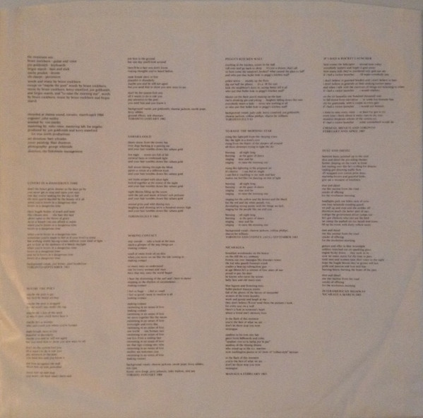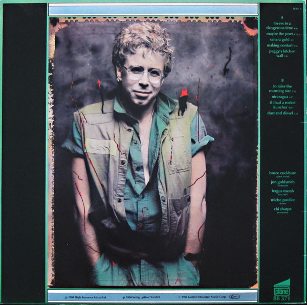 Label : A&M Length : 50:48 Released : 1984 Review (AllMusic) : After visiting Central America, Bruce Cockburn recorded Stealing Fire, part of which passionately and eloquently details what he'd seen while in Nicaragua and Guatemala. With the opening track, the terse rocker "Lovers in a Dangerous Time," Cockburn conveys both a sense of urgency and uncertainty. There's a brief calm as the second half begins, before a triad of songs written about his time spent in Central America brings the record to a sober conclusion. These three tunes, which, like the majority of the album, sport a tight, worldbeat, folk and rock flavor, are the true highlights of Stealing Fire, and Cockburn at his very best. The first, "Nicaragua," is part observation, part commentary, and part tribute to the Sandinista-led revolution in that country. "If I Had a Rocket Launcher" follows, and is arguably Cockburn's most powerful merging of personal and political feelings. Written after witnessing Guatemalan refugees being chased across the border by gun-wielding helicopters, "Rocket Launcher" evokes not only the pain and suffering of the people, but the conflict between Cockburn's pacifist leanings, and the vengeful anger and hatred incited by such a horrific sight. The Nicaraguan, road-inspired "Dust and Diesel" closes the record with a portrait of a country whose daily contrast of beauty and violence is summed up by the images of people who are proud, hopeful, passionate, afraid, and tired. Stealing Fire, despite a few less than compelling tracks, is the work of an artist at his peak. It also contains some of the most intensely significant material by a singer/songwriter in the 1980s. |