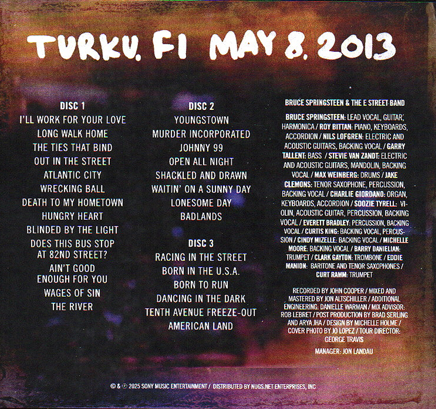 Label : Nugs.net Venue : HK Areena, Turku, Finland Recording Date : May 8, 2013 Quality : Soundboard Recording (A+) Review (Kieran's Thoughts) : For the second month in a row, Bruce Springsteen’s Archive Series spotlights a tour previously represented this year. Yet, where the March release of Omaha, November 15th, 2012 captured Springsteen and the E Street Band blending their tribute to Clarence Clemons with much spontaneity, for the First Friday of December, night two in Turku, from May 8th, 2013 – the Series’ fourth instalment from the second year of Wrecking Ball – leans greatly on the side of the latter, with a wide array of delights scattered throughout the show. Much like Omaha 2012, this show has been long sought after by fans with it most fondly remembered for the world debut of River outtake, “Wages of Sin,” a performance deemed to be so special, Bruce promptly had it uploaded to his YouTube channel. Remember the Live Downloads and Archive Series releases were many months away at this point, and if something was going to be released by BruceInc, it had to be worth it. As we revisit “Wages of Sin” now, we’re reminded that Bruce’s call was most definitely worth it. While “Wages of Sin” is rightfully remembered as May 8th’s absolute highlight, it wasn’t the only stand out, or shocker, to shape this show. Bruce wasted no time in presenting his Turku audience with a song befitting that description, as he stepped onstage solo with an intimate, tour debuting “I’ll Work For Your Love.” A lot more polished compared to the reading from Wembley 2016 that I recently wrote about on this site with no stops and a firmer sincerity from Bruce – in the final moments especially; I really like the smoothness of his “What others may want for free, I’ll work for your love dear…” – this was a terrific way to get those in HK Areena warmed up for the night ahead, and more importantly, to make sure they knew Bruce was all in for this challenge. With a “Good evening!” he called on the E Street Band, and they proceeded to get started on putting the words of that opener into action. Their first communal statement was the song that would later be described by Bruce as the “prayer for my country,” a titanic “Long Walk Home.” Still a much underplayed gem post-Magic here, this second appearance on a 2013 release after Cardiff last year puts into focus the respect Bruce could place on certain tracks even with the spontaneity so rife – the song actually remained around the set for most of the month following this show, making four further appearances out of the next seven shows. Another communal statement followed in a hard hitting rendition of “The Ties That Bind,” given an extra oomph by way of Jake Clemons’s punctuated saxophone solo, and they continued down The River (briefly) with “Out in the Street” for added community and more delectable horns efforts also – it was the combination of Ed Manion, Barry Danielian, Curt Ramm and Clark Gayton shining on this occasion. An exclamation point well and truly placed on a fervent opening portion. Amidst wild cheers from the female demographic of Turku, the atmosphere shifted, as Max Weinberg’s drums, cutting guitars and a gritty, damning Springsteen vocal fronted an unforgiving “Atlantic City.” This one could also be viewed as somewhat communal, be that in the protagonist’s unyielding optimism or Bruce’s rumbling cries of “Come on and meet me!” late on; Little Steven Van Zandt complementing very nicely with his backing vocal, but this performance strikes us best as a fiery sociopolitical anthem (even more so than “Long Walk Home” moments earlier). It wouldn’t be the last either, and although this isn’t the purest example of a Wrecking Ball show, there’s evidence to prove that its early themes hadn’t entirely made way for waves of sign requests. Appropriately, the tour’s title track followed – with “TURNED INTO PARKING LOTS!” another rumbling declaration – before the intense “Death to My Hometown” to ensure a quick album spotlight. Only one more touring track, “Shackled and Drawn,” would feature across the rest of the show, as part of a sociopolitical sequence, but before that… some light for the wave of signs in front of Bruce. The most eye-catching stretch of the show began with the “first song from my first album,” and with a nod to Clarence Clemons’ presence on Greetings From Asbury Park, NJ – Bruce noted that he was only on two songs “because we couldn’t find him,” in another example of this tour’s primary theme at the fore – “Blinded By the Light” thrilled with nice, punctuated vocals and a strong effort from Jake. Initially, the minor touch of “Early-Pearly in her Curly Wurly” chaos was commendable in a song that often borders disarray, but then, “Wait a minute boys! I forgot a verse!” was more like it as Bruce solidly recovered and rolled it back for the final verse. We can afford Bruce and the band some leeway in a show that saw them play a song live for the first time, we just don’t expect to give them it in a song they’d been playing since 1972! There was less commotion in the next song, its LP brethren “Does This Bus Stop at 82nd Street?” – also marking forty years of live performances. It further buoyed with barnstorming efforts from the Horns in particular en route to the percussion duel between Max and Everett Bradley, but it was to be greatly overshadowed by the two songs that followed. Bruce described the first as a “very obscure, strange song,” but one he couldn’t avoid on account of two people having requested it. Satisfaction was promised and satisfaction was delivered with Max rumbling all into another horns anchored delight, “Ain’t Good Enough For You” – the Darkness on the Edge of Town outtake which makes its Archive Series debut as part of this release. In its second outing o