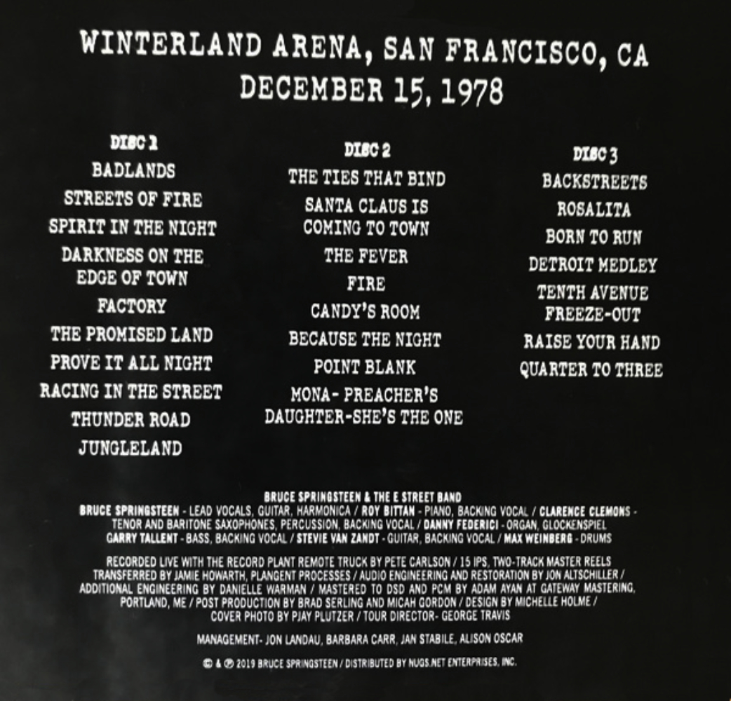 Label : Live.BruceSpringsteen.net Venue : Winterland Arena, San Francisco, California, USA Recording Date : December 15, 1978 Quality : Soundboard Recording (A+) Review (Kieran's Thoughts) : If you’ve followed my Archive Series reviews for a while, I imagine that you don’t need any more convincing about why the Darkness Tour is the essential Bruce Springsteen and The E Street Band live experience. With seven shows from ’78 now released, the two shows from Passaic, The Roxy, Houston and The Agora are all essential examples of why the tour is as revered as it is. So, if you’ve never heard the first show from Winterland before you may be wondering what makes it so special? Well, with the year and tour coming to an end and Springsteen and his six bandmates being more than made men after their strenuous efforts in every show, there was nothing to prove and also nothing really stopping them from taking it easy. That’s just not what Springsteen and The E Street Band do, though. The fact that the first night in Winterland sees these seven men going all out to try and top themselves after the likes of The Roxy and Passaic is indicative of their professionalism, and even though I don’t think this tops the first night in the Capitol Theatre, the fact it comes close is the reason why it’s been at the top of everyone’s live downloads wish-list for the entirety of the project. As you would expect, the setlist isn’t massively changed to the one on the Passaic release from this past September and twenty of Winterland’s twenty-five tracks feature in the show from New Jersey, but when it comes to shows from ’78 what was played is inconsequential. The final radio broadcast, alongside The Roxy, The Agora, Passaic and Atlanta, will forever be touted as one Springsteen’s greatest nights based on the quality of playing alone. After playing my “Winterland Night” CD to death in 2015 my initial reaction to this release was “a great moment for the Series, but I’ve already been wowed by this one“. As soon as I heard Bill Graham mention “the chairman of the board” for the first time in about two years, I was more than ready to be wowed again. Audio-wise, it’s not perfect (“The Promised Land”, “Jungleland”, “Fire”, and “Quarter to Three” are all taken from a two-track of the broadcast and are not master-tape quality) and I’d place it fourth in that category of ’78 releases behind Passaic #2, The Roxy and Passaic #1, but given how I can clearly hear Bruce’s raw vocals, the instrumentals of each E Street Band member as well as the audience’s participation when needed, there’s no reason to be disappointed if you’re an audiophile. Each song performance is an E Streeter masterclass and I love how one particular instrument takes priority on each of the twenty-five tracks. Obviously “Badlands” and “Streets of Fire” – I’m so glad to have gotten two releases in 2019 with this one on – are guitar-driven and the blend of Bruce and Stevie’s during the opening song is a beautiful mess. That being said, these two songs feature prominent moments from Clarence, Roy and Danny, while the work of Max and Garry can’t go unmentioned, but their participation is so routinely brilliant at this stage (of the Darkness Tour and these Archive releases) that it may seem pointless to waste time praising them. Mind, I do have to give credit to the work of Jon Altschiller and Adam Ayan as far as being able to hear Garry’s bass playing in the show is concerned. I’ve mentioned in the past that at times you can’t hear him very well in mixes and have to listen extra hard as a result, but in this one he stands out so much during songs such as “Racing in the Street” and “Point Blank” and it’s fantastic. Needless to say, those two also have so much more about them than Garry’s bass spurring them forward. Listen out for the soulful singing of Bruce and that always mesmerising coda in “Racing” that leads into “Thunder Road” and the rare “Baby” section in the much more rock-styled “Point Blank”. In a first set that has arguably five of Bruce Springsteen’s greatest ever songs played, it’s not “Racing” or “Thunder Road”, “The Promised Land” or “Jungleland” that stand out as the highlight of this first hour, no that honour goes to “Darkness on the Edge of Town”, dedicated to Ron Kovic after Bruce mentions his reading of “Born on the Fourth of July”, and the tour’s titular track is sung with an aggression that is so important when we consider how Bruce’s worldview was so impacted by the Vietnam War and the treatment of Vietnam Veterans. We can hear the anger in every drumbeat by Max, every guitar strum by Bruce and Steve and with the dedication to Ron in the back of our minds, the sequence where Bruce sings “I lost my money when I lost my wife, those things don’t seem to matter much to me now” before screaming the song’s most vehement lyrics has perhaps never been more true. “Darkness” has really been my favourite Springsteen song this year, and to hear this version as it draws to a close (regardless of how many times I’ve heard it since 2015) really confirms why it’s above the rest. While it seems somewhat unnecessary to mention that a lot of the song performances in this aren’t the same as in the other releases from the tour, I do feel like it’s important to highlight the inclusions and evolutions of the yet-to-be-released tracks: “The Ties That Bind”, “The Fever” and “Point Blank”, alongside the close to (if not actually) perfect versions of “Prove It All Night”, “Mona” – “Preacher’s Daughter” – “She’s The One” and “Backstreets” provide brilliant examples of Springsteen and The E Street Band in the rough early formative stages of their music and also of them having mastered alternative versions of their songs. The slower intro into “Ties” has alwa