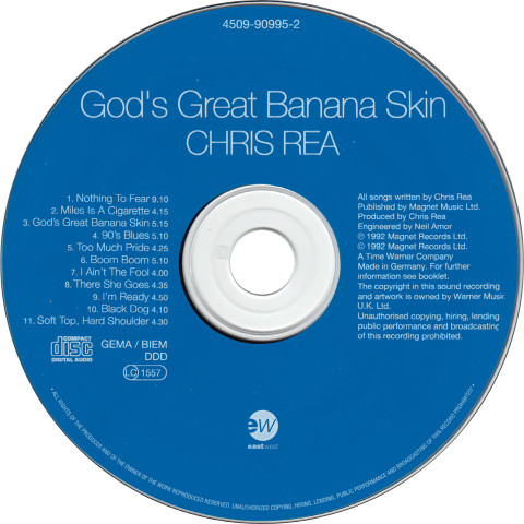Label : Magnet Records Release Date : November 2, 1992 Length : 55:55 Review (Wikipedia) : God's Great Banana Skin is the twelfth studio album by British singer-songwriter Chris Rea, released in November 1992. The album was not released in the United States, though some tracks later appeared on the US release of Rea's following album Espresso Logic. The single "Nothing to Fear" reached number 16 in the UK Singles Chart, and its music video was filmed in Morocco. The album reached number 4 in the UK Albums Chart in 1992. The song "Too Much Pride" was featured in the 1993 erotic thriller, Cold Sweat. The Guardian wrote: "In the snug world of centrally-heated adult rock, Chris Rea offers a reminder that he plays a handy slide-guitar, and creates chunky chordscapes which perfectly complement the gravelly rasp of his voice." |