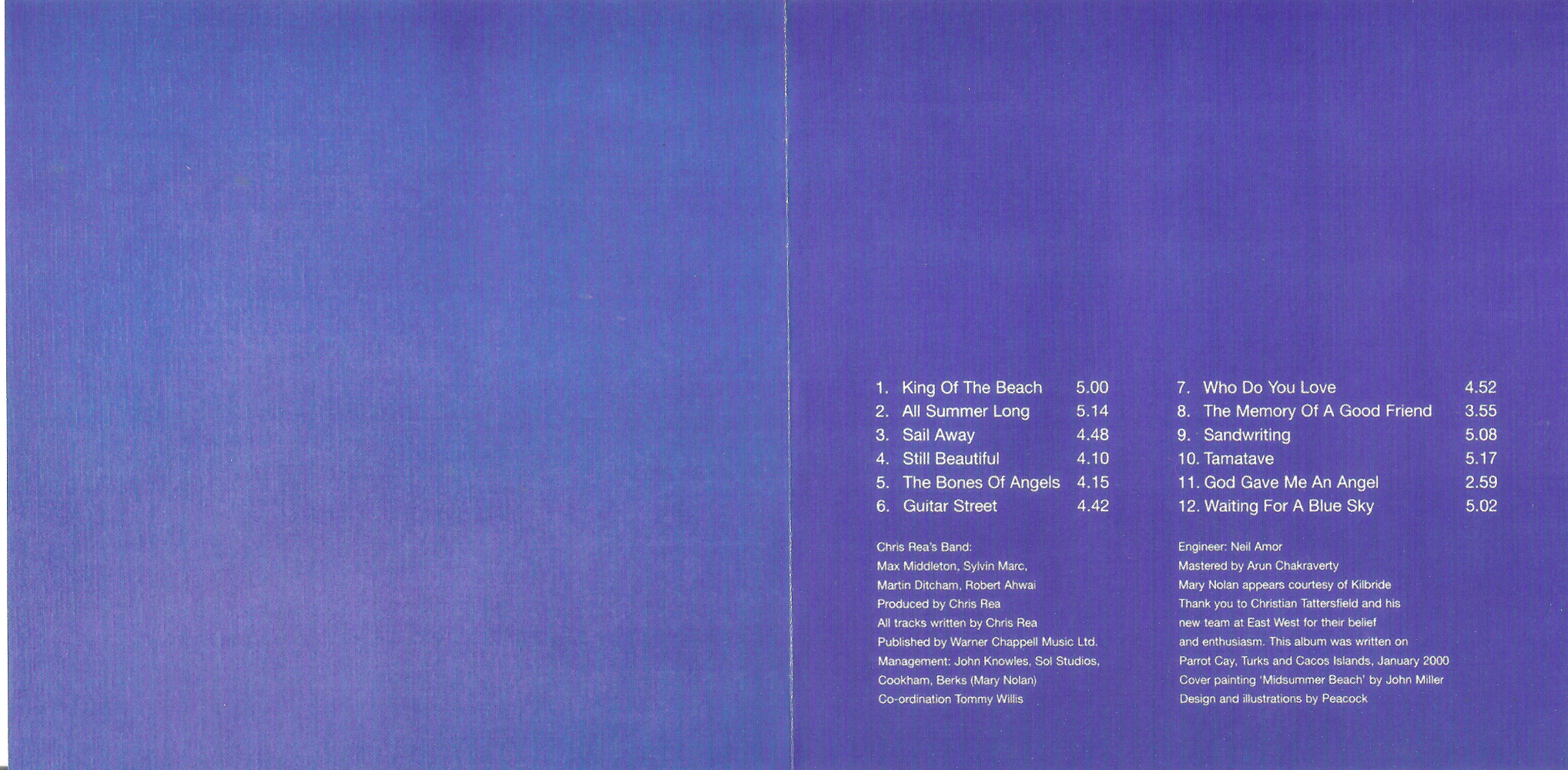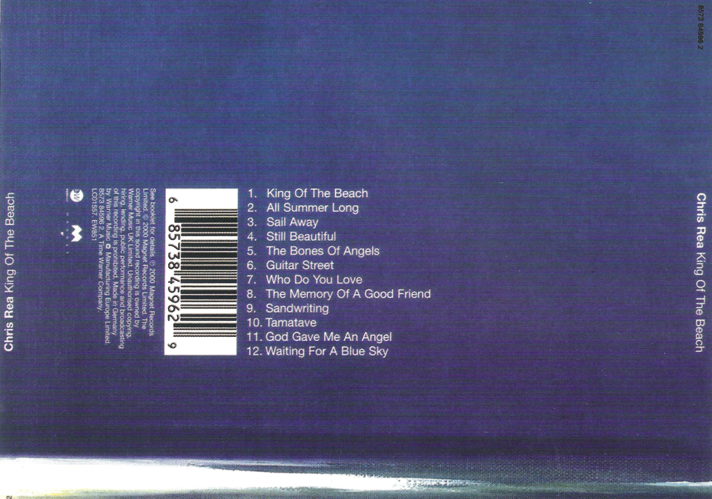 Label : Magnet Release Date : October 31, 2000 Length : 55:15 Review (AllMusic) : A sequel of sorts to his earlier On the Beach, King of the Beach continues the laid-back mood of the earlier album but is (despite the goofy title) a more mature and unified work. It's one of his best albums and is a return to form after the film soundtrack La Passione and the more electronic sounds of The Road to Hell Part 2. Written primarily during a vacation in the Turks and Caicos Islands, it's replete with lots of beach and summer imagery in the titles ("King of the Beach," "All Summer Long," "Sandwriting," "Sail Away") as well as the lyrics, which were originally written as poems. A remix of "All Summer Long" was a big dance hit in Ibiza and other Mediterranean hot spots. A good album for a summer day, with a soulful mellowness flowing through the tracks. Review (Hot Press) : After the commercial disaster that was La Passione (both the film and Rea's over-indulgent soundtrack) and last year's less than spectacular revisit to the Road To Hell (Part Two) the Middelsboro' bottle blonde returns to yet another familiar theme. After the commercial disaster that was La Passione (both the film and Rea's over-indulgent soundtrack) and last year's less than spectacular revisit to the Road To Hell (Part Two) the Middelsboro' bottle blonde returns to yet another familiar theme. King Of The Beach, as its title suggests, is replete with nostalgically evocative summer imagery and warm, hazy melodies – imagine Don Henley's 'Boys Of Summer' slowed down a tad and spread over an entire album and you've got the picture. 'All Summer Long' the current single and a close relative of his previous hit 'On The Beach' is pleasant enough in a radio-friendly sort of way. The title track is even more typical Chris Rea fare, his lazily assured vocals and meandering slide-guitar over a mid-tempo, reggae-lite rhythm. But it's the more subdued tracks which predominate here. Among them 'Sail Away' is a gorgeous get-away-from-it all ballad, while 'Still Beautiful' and 'Who Do You Love' yearn for long lost loves over similarly brooding melodies. 'Sandwriting' and 'Waiting for a Blue Sky' pick up the beach boy theme again and only 'Guitar Street' a more bluesy excursion, and 'Mississippi', which broaches Randy Newman territory, depart from the predominant theme. Rea has an engaging, instantly recognisable voice, he can write strong melodies and is a skilful guitar player. Only thing is, he's done it so many times before in precisely the same manner. If you want more of it, here it is. |