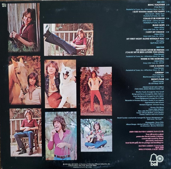 Label : Bell Records Length : 34:57 Released : 1972 Review (AllMusic) : The same machinery in place to churn out lightweight sides under the Partridge Family moniker was also responsible for David Cassidy's first solo effort, Cherish. After a few contractual loopholes were attended to, Wes Farrell, music producer of all things Partridge, began assembling material for Cassidy's debut. In many ways the album is distinguishable in name only, as the same musicians, arrangers, and other behind the scenes crew that had so carefully and successfully created the sound of "the Family" are also incorporated into this effort. Most prominent were Wrecking Crew studio stalwarts Hal Blaine (drums), Larry Carlton (guitar), Joe Osborne (bass), and Larry Knechtel (keyboards), who are joined on backing vocals by the six-member Love Generation. There are a few notable exceptions, such as the effective title "Cherish" -- which had been a career-defining hit for the Association six years earlier. Cassidy took it to number one on the adult contemporary chart in December of 1971. Another interesting inclusion is "Ricky's Tune," a strong pop ballad penned by Cassidy for his ailing dog. While the vocalist had penned a few numbers that had ended up on Partridge Family long-players, there is a maturity present here that many of his previous songs lacked. Other standout tracks include the Bobby Hart co-composition "I Just Wanna Make You Happy" and the marginally maudlin "I Am a Clown." The latter is particularly interesting for the spoken interlude that recalls "Doesn't Somebody Want to Be Wanted" from the Partridge Family's Up to Date (1971) album. Overall, Cherish is an admirable first time out and, above all, continues to display the vocalist's theatrical sensibilities and performance style. |