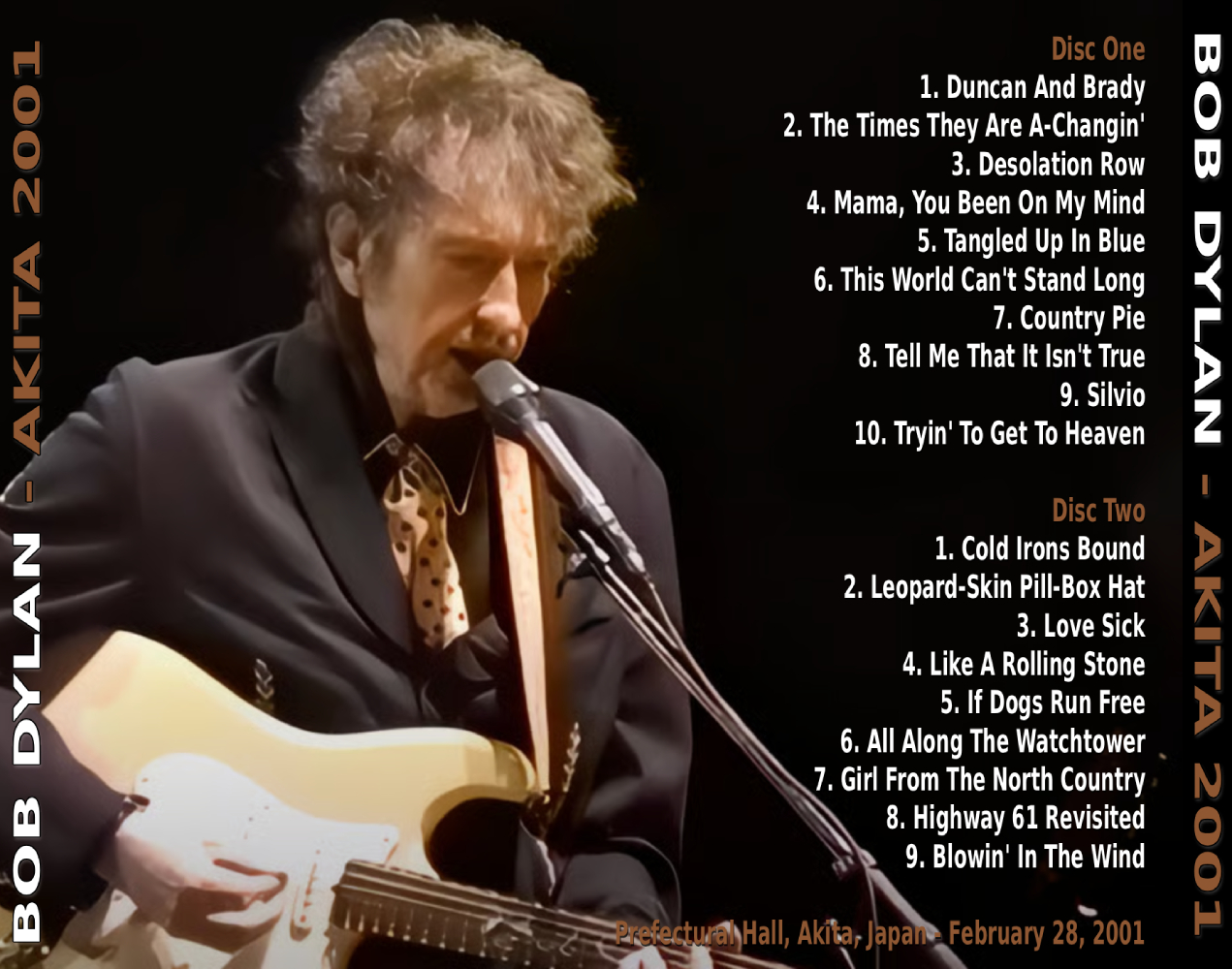 Label : no label Venue : Prefectural Hall, Akita, Japan Recording Date : February 28, 2001 Quality : Audience Recording (A+) Review : Bob Dylan played a 19-song set at the Prefectural Hall in Akita, Japan, on February 28, 2001, featuring a mix of acoustic and electric sets as part of the Never Ending Tour. The sound on this recording is fantastic. Gorgeous, warm, close-up vocals. This is truly a great recording! Wonderful show, too. |