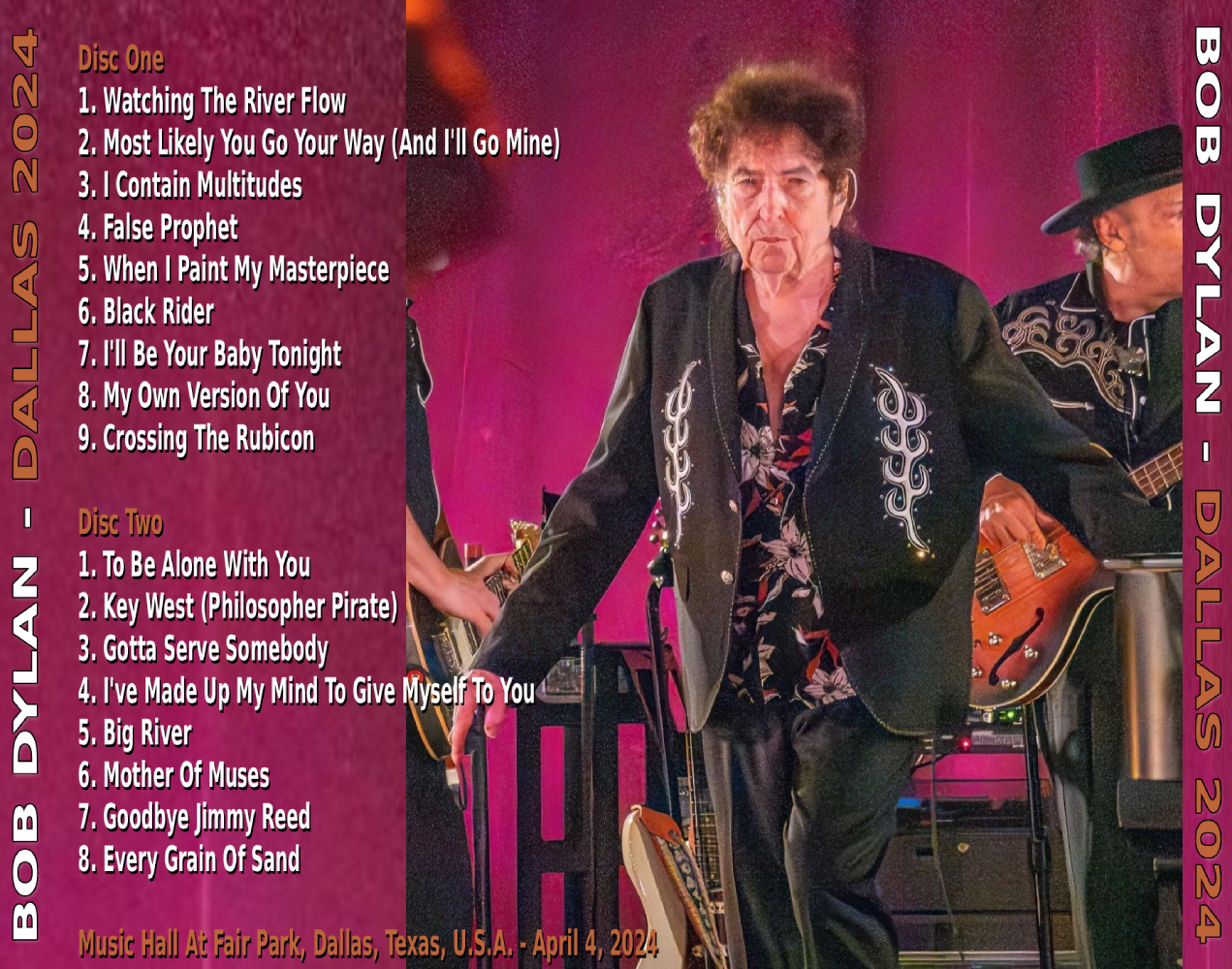Label : no label Venue : Music Hall At Fair Park, Dallas, Texas, USA Recording Date : April 4, 2024 Quality : Audience Recording (A+) Concert Review (The Dallas Observer) : Bob Dylan Brings It All Back to Dallas With Hypnotic Fair Park Performance The Nobel-winning wordsmith musician still has the spark he's carried since his old days in the Village. In concert, as in most any other public, visible aspect of his life, Bob Dylan is resolutely inscrutable. The pride of Hibbing, Minnesota, is almost more mirror than man at this point - or maybe he always was. On the cusp of turning 83 (on May 24), the iconic singer-songwriter - listing his innumerable accolades, from Grammys to the Nobel Prize, and detailing his vast, enduring influence would be a novella unto itself - has long served as something of a reflective surface for casual and obsessive fans alike. You see, hear and feel what you want; you take from him whatever meaning you're meant to glean. His eclectic, enthralling music, embedded in multiple generations of listeners, remains stubbornly eternal - the visceral snare drum snap, followed by the low punch of kick drum launching "Like a Rolling Stone," for instance, quickens the heart as easily in the TikTok era as it did the age of rotary phones - and, even half a century later, is as woolly and indefinable as it is moving and important. To understand that Dylan is one of the indisputable architects of modern popular music makes it no less overwhelming to watch him, alive and in front of you, continue to chase his muse down whatever paths it leads him. Dylan returned to North Texas and the Music Hall at Fair Park Thursday night, as his Rough and Rowdy Ways tour, ongoing since late 2021, approached its terminus. He'll wrap this two-and-a-half year, eight-leg stint with a two-night stand in Austin on Friday and Saturday. He was back in town relatively soon after his last trip through the area, which was also part of the Rough and Rowdy Ways tour, having performed at Irving's Pavilion at Toyota Music Factory in March 2022. (Thursday's appearance in Fair Park was Dylan's first at the venue in almost 34 years, the last coming on Sept. 6, 1990, just five days before the release of Under the Red Sky.) The lengthy excursion was launched in support of his 2020 LP Rough and Rowdy Ways, a sharp, sprawling late-career masterwork that served as the foundation for Thursday's roughly 105-minute performance. Attendees were required to seal their devices inside provided Yondr pouches prior to the performance, ensuring the focus was on the stage, not their palms. Backed by a razor-sharp quintet - guitarists Bob Britt and Doug Lancio, bassist Tony Garnier, drummer Jerry Pentecost and multi-instrumentalist Donnie Herron - Dylan appeared on stage at 8:04 p.m., dressed all in black, and took his seat behind what looked like a baby grand piano. The Music Hall stage was simply dressed and perfunctorily lighted, with some sheer curtains serving as a backdrop on all sides and some spotlights on stands scattered about the musicians, who formed a loose semicircle behind Dylan. It gave the odd sensation of watching a band working through a rehearsal, rather than a performance, as the musicians often seemed laser-focused on Dylan's hands as they jumped across the piano keys, and tried to hang with the mercurial shifts in tempo, tone and phrasing. That the evening occasionally rose above a steady simmer to approach a rolling boil - "False Prophet" built up a lovely head of steam, full of bluesy menace and bite; "To Be Alone with You" was one of several moments Dylan added a filigree of impassioned harmonica, even engendering some audience participation - was a testament to the prodigious skill of his collaborators. It cannot be easy, even after all these nights, to step out onto a high wire and hope for magic to materialize. (The geographically specific covers he's been doling out on the tour didn't pan out for Dallas: the setlist slot typically devoted to each night's surprise was given over to Johnny Cash's "Big River" Thursday.) Dylan said little more than "Thank you" to those assembled. The room was nearly sold out, but scattered pockets of open seats were visible here and there. His indifference to the occasional standing ovations did little to deter the vocal appreciation he was shown from the moment he stepped on stage. To step inside a late-period Dylan performance is to confront a handful of truths, which even despite the man's fondness for the slipperiness of perception and sleight of hand, cannot be denied or ignored. The most pressing and obvious truth is no matter how invigorated or inspired Dylan may seem when he's on stage - this time around, largely parked on a piano bench for the duration - the master is much closer to the end of his days than the beginning. As the man once sang, it's not dark yet, but it's getting there. Thus, an air of fragility and inevitability haunts the proceedings, giving the evening a heft and depth far beyond a simple Thursday night rock concert. Mortality lingers in the margins of all our lives, artist or no, promising nothing and capable of taking everything in a blink. Is this the last time for him, for us? We just don't know. Another truth is Dylan, quite simply, isn't here to please any of the paying customers. Satisfaction is his alone, and hoping for anything otherwise is a fool's errand. His records are the starting point for him, a moment in time preserved, and not the model for how he approaches a song of any vintage in his catalog, whether it was cut during the Nixon administration or during Obama's. Tangled Up in Bob Show up expecting to hear, say, "All Along the Watchtower," "It's All Over Now, Baby Blue" or "Visions of Johanna" rendered as they were upon first release, and you will be mightily disappointed. He is as indifferent to the known structures, tempos and melodies of songs released less than five years ago as he is those ingrained in the American cu