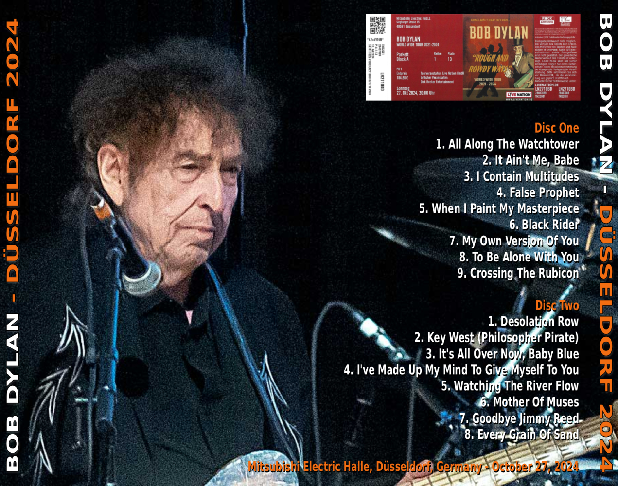 Label : no label Venue : Mitsubishi Electric Halle, Düsseldorf, Germany Recording Date : October 27, 2024 Quality : Audience Recording (A+) Review : Excellent wonderful audience recording ! Dylan, at age 83, is in great shape. Concert Review (Boblinks) : Dylan has for a long time been in the process of reinterpreting his songs in a very peculiar way. It almost seems like an experiment in phrasing, where he delivers the lyrics with a rhythm/metre that almost never follows the underlying chord changes in a conventional way, while simultaneously almost completely stripping the lines of their melodic content. To take a random example from the setlist: in Desolation Row the lines almost all end in some sort of growl which resembles either the root note or fifth of the scale. How he reaches this growl melodically doesn't seem to matter much, such that the song becomes (melodically) almost unrecognisable and interchangeable. Generally the more recent the song, the less it has suffered from this process of degradation (although it was probably less melodic to begin with). The songs from Rough and Rowdy Ways, therefore, were passable and at times even moving. But the influence of the "cruel experiment" is still noticeable. I Contain Multitudes has some sort of melody on the album, for example the major third in "... yesterday too" in the first line, but this melodic flourish was surgically removed in the live version. This process I assume is known to all Dylan fans on this site. However, Bob has reinvented himself once more. An entirely new part of the experiment involves adding piano intermezzos in almost every song, which consist of very basic scale runs, arpeggio's or chords that often do not match the underlying harmony. In Desolation Row he runs up and down the E dorian scale (that is, a minor scale) over a very basic progression of E, A and B major chords, which produces a sound that is very out of place in the rock/folk/pop genre. It is only a slight exaggeration to say that it sounds like a toddler bashing keys at random. One has to (sadly) assume that it is intended. The process seems to have become so automated that Bob throws in some "wrong scale runs" in between lines or even while playing harmonica, such as in It's All Over Now, Baby Blue. I am fascinated to learn where this experiment leads and how musicologists will look back on it decades from now. I will, however, not be visiting a Dylan concert again. |