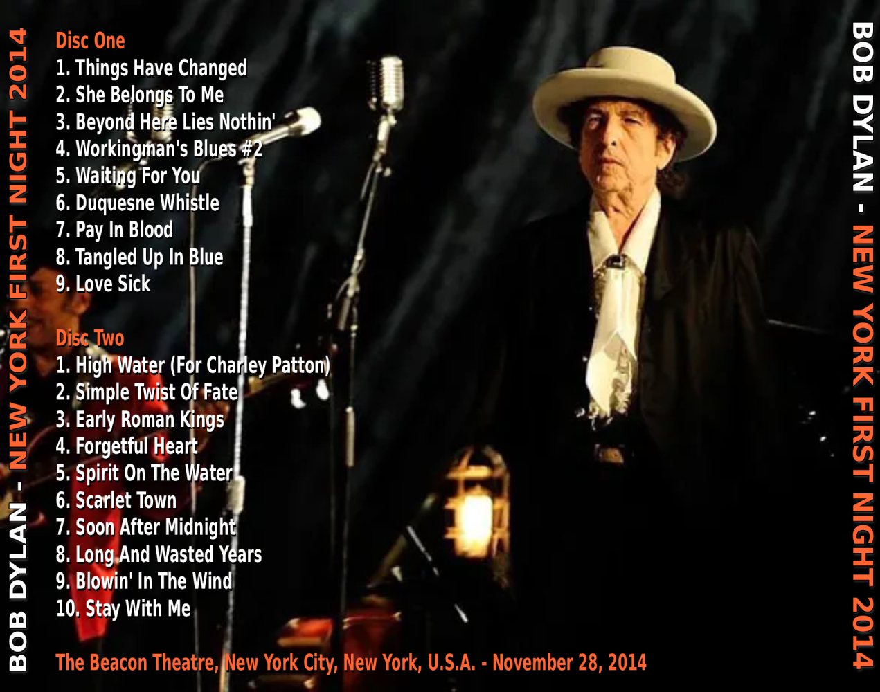 Label : no label Venue : The Beacon Theatre, New York City, New York, USA Recording Date : November 28, 2014 Quality : Audience Recording (A+) Concert Review (The New York Post) : At 73, Bob Dylan easily could have packed it in a few years back and lived off his Social Security check. Instead, he continues on what’s billed as The Never-Ending Tour. This year’s version hit Dylan’s old stomping grounds, New York City, Friday night for the first of five shows at the Beacon Theatre. And the results were satisfying at the very least. He began the show promptly, at just four minutes past the 8 p.m. start listed in the tickets, centerstage at the mike, wearing a white bolero hat, lose white button-down shirt with a white tie or scarf and a thigh-length black jacket with white piping. Dylan got right into “Things Have Changed,” his Oscar-winning song from “Wonder Boys” — and later used for a car commercial (yeah, things have changed). His voice was froggy and his five-piece band was hot. He followed that with “She Belongs To Me,” from 1965’s “Bringing It All Back Home. It was one of only two songs from the ’60s Dylan pulled out of his bolero for his 19-song, two-hour show (including a 20 intermission). For this one, he broke out the harmonica, which got the sold-out crowd fired up. I’ll admit to being partial to early Dylan, so I thought I’d be disappointed with the paucity of songs from that era. But the highlight of the show didn’t come from the few “Blood on the Tracks” and earlier tunes. He played six songs from his last studio album, “Tempest,” from two years ago. And for that album’s “Duquesne Whistle, which Dylan sang from the baby grand piano to the side of the stage. Dylan and His Band (as opposed to The Band, with whom he used to perform back in the day) put out a finger-snapping, head bopping boogie-woogie rockabilly tune that you could almost see teens from the ’40s and ’50s dancing wildly, tossing themselves in the air, to the tune. Plus, who doesn’t like a good train song. Eight songs in, we got “Tangled Up In Blue,” from “Blood on the Tracks.” As he changed the phrasing and emphasis of different words — like he always does when performing his classics — the crowd gave a mighty roar each time the chorus “Tangled Up In Blue”came around. His other “Blood On the Tracks” number was a “Simple Twist of Fate.” And just before the intermission, lead guitar Charlie Sexton, shot out a few jolts of fuzzy electric guitar to get everyone’s attention (as if Dylan didn’t have it already) leading into the bitter “Love Sick.” “My feet are tired, my brain is wired … I’m sick of Love,” Dylan growled. Then he told us he and the band were taking a break and would be back. The only thing he said all night. While a number of the songs sounded too similar, thanks to the singer’s chronically horse-sounding and sometimes montone-ish voice, there were plenty of different styles to make up for that. There was the boogie-woogie rockabilly mentioned above, a Latin-tinged, syncopated hand-clapper in “Beyond Here Lies Nothing” from 2009 and plenty of country (thank you Donnie Herron and your pedal steel, electric mandolin and banjo), and some swing, most notable on “Sprit On the Water,”from “Modern Times.” Dylan seemed to be enjoying himself. And at times, he was, dare I say it, jaunty. He stepped away from the mike on a number of songs, set his legs apart, put his left hand on his hip and nodded to the music. And while he was no Iggy Azalea when it comes to dancing onstage, he did a bit of a shuffle at times and almost smiled, too. And he was also unflappable. During “Spirit On the Water,” a “fan” jumped up onstage and started dancing. He was tackled off the stage by security, and Dylan, playing his piano near the commotion, didn’t miss a beat. (The crowd cheered as the interloper was ejected.) After the last of the “Tempest” songs, “Long and Wasted Years,” Dylan and his guys left the stage, returning for the inevitable encore — two songs worth. Dylan sat at the piano for “Blowin’ In the Wind,” the 1963 great best-known as a guitar song, as he seemed like he might be telling his grandkids something: “You know, the answer, my friends is …” The finale was unlikely, but something he plays most every night on this tour: “Stay With Me,” a song Frank Sinatra recorded, also in 1963, for a movie, “The Cardinal. Whatever the expectations are of Bob Dylan, there is no doubt he does it his way. |