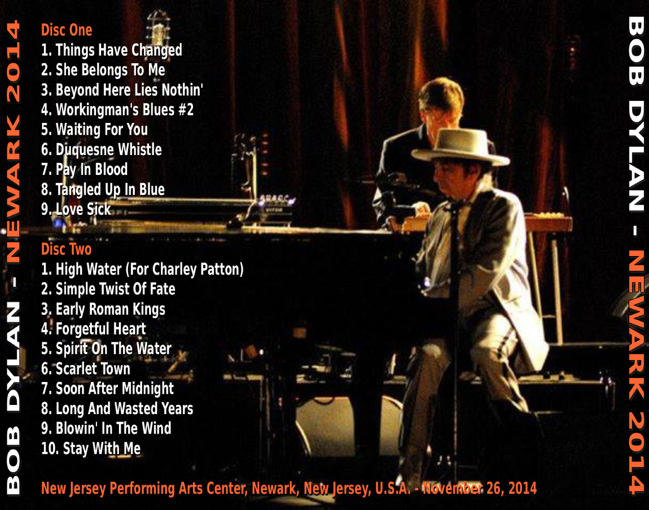 Label : no label Venue : New Jersey Performing Arts Center, Newark, New Jersey, USA Recording Date : November 26, 2014 Quality : Audience Recording (A+) Concert Review (NJ Arts) : When Bob Dylan and His Band stopped at the New Jersey Performing Arts Center in Newark on Wednesday (prior to a five-shows-in-six-nights residency at Manhattan’s Beacon Theatre, which begins on Friday), the 73-year-old legend arrived needing to confront not just the shadow of his own mortality, but his faltering live reputation. For decades, a Dylan concert usually involved the artist shuffling through his prodigious back catalog, rearranging and rewriting beloved hits into ungainly new configurations. Unfocused and indifferent onstage, Dylan gave the impression that the “Neverending Tour” had become an unending bore. But from the moment he stood on NJPAC’s stately stage and focused his froggy croak of a voice on his Academy Award-winning “Things Have Changed,” his audience — mostly composed of diehard middle-aged fans, along with a handful of teen and 20-something acolytes — knew that Dylan was back. These days, Dylan constructs a setlist and sticks to it religiously for weeks on end, so his NJPAC show didn’t pack any surprises. But by forgoing his penchant for improvisational riffing on old favorites, Dylan and his band regained a focus and intensity unseen for years. At my last Dylan show in 2005, the band mangled simple three-chord tunes like “Tombstone Blues” and “It Takes a Lot to Laugh, It Takes a Train to Cry” beyond recognition. No more. The current set showcases Dylan’s 21st Century catalog, with six songs from his 2012 album Tempest as well as recent releases like Modern Times, Together Through Life and Time Out of Mind. Invariably downbeat, blues-based and autumnal, this material imbued the evening with a theme-like vibe quite unlike the prototypical “greatest hits” late-career tour. Dylan’s crack backing band, featuring Charlie Sexton on lead guitar and the versatile Donnie Herron (switching between banjo, viola, violin, mandolin, pedal and lap steel) kept everything sounding fresh and vital. You’d never guess these players have been doing these same songs night after night. “She Belongs to Me” from Bringing It All Back Home proved to be the only ’60s track in the set (other than “Blowin’ in the Wind,” saved for the encore and rearranged with new chords into a country waltz). One of the night’s few off-notes occurred when Dylan had a senior moment and started playing the wrong harmonica, resulting in a Glenn Branca cacophony instead of the song’s usual melodic bridge; but Dylan coolly walked to the back of the stage, swapped harmonicas, and finished the song without so much as a self-referential chuckle. Never big on stage patter, the singer conserved his voice throughout the two-hour performance, only saying a quick “thank you, we’ll be right back” before the intermission and an equally curt “thank you” at the end of the night. “Tangled Up in Blue” and “Simple Twist of Fate” represented 1975’s critically acclaimed Blood on the Tracks, the former transformed into a forlorn country waltz; the fairly obscure “Waiting for You” (written for the soundtrack of 2002’s “Divine Secrets of the Ya-Ya Sisterhood”) also found its way into the set. But for the most part, Dylan gave us songs written in the last 10 years, and clearly enjoyed playing them. He sat behind a grand piano to pound out creditable boogie-woogie for the romping country swing of “Duquesne Whistle” and the barrelhouse blues of “Early Roman Kings.” But it was when Dylan stood alone at center stage, grasping the mike stand, that he really came alive, occasionally “dancing” across the stage (which amounted to an arthritic sashay and shuffle, usually ending with his hand cockily slapped to his hip). The Tempest material, which formed the bulk of the night’s second set, proved remarkably compelling, even if “Long and Wasted Years” lacked the drama usually expected from a closing number. Granted, no one expects “Like a Rolling Stone” anymore, but artists are supposed to leave an audience wanting more, not a nap. Dylan’s voice certainly isn’t what it once was, but it remained strong and tuneful throughout the set, never more so than when he ended the show with “Stay With Me,” a romantic ballad popularized by Frank Sinatra in the ’60s. “Stay With Me” served two purposes: First, it’s a foreshadowing of Dylan’s next studio album, reportedly a collection of American standards due in 2015. But the song’s melancholy lyrics about commitment and devotion — “Should my heart not be humble, should my eyes fail to see, should my feet sometimes stumble on the way, stay with me” — seemed not so much a lament to an ex-lover, but a message from the Bard to his audience: Stay with me, and I’ll make it worth your while to come back. |