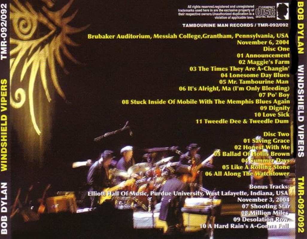 Label : Tambourine Man Records Venue : Brubaker Auditorium, Messiah College, Grantham, Pennsylvania, USA Recording Date : November 6, 2004 Quality : Audience Recording (A+) Review : Nice bootleg with a very good recording of Bob's concert in Grantham, 2004 with bonus tracks from West Lafayette, November 3, 2004. Concert Review (BobLinks) : The self proclaimed song and dance man - Mr. Bobby Dylan made it to Messiah College last night. As the ticket says - In Show and In Concert. He played their gym which according to the paper only 1600 tickets were sold. It was standing room on the floor and the top half of the bleachers were the cheaper seats for the students - even though quite a few sprung the 49.50 to sit down front. The intro was a bit shorter than usual - "He started out in the 1960s - drugs and alcohol hit him hard - in the 70's he found Jesus - he faltered in the 80's but went on to make great records with Lanois in the 90's - Columbia recording artist bob Dylan." The entire band was dressed in black. Bob stood stage left at his electric piano - he wore a black suit with white buttons up the outside of the bottom part of each leg. He also wore a black cowboy hat the entire show. He had on a scarf around his neck worn like a tie - and some sort of shiny jewelry around his neck. They opened with a strong "Maggies Farm". Its the first time I saw his new guitarist Freddie - he is really good - he is the lead guitarist he has needed for years - he can play actual rock leads and his spooky fills are really good. He also must be about 6'5" - he's a big guy. "The Times they are a Changin" was next - pleasant enough country - he only partially destroyed it. "Mr. Tambourine Man" was not too good - a slow sing song pace that made no sense. His vocals were a bit harder to understand than usual. Not as bad as when he was drunk in the 80's - at least now he is trying - but he doesn't have a whole lot to work with. "Its Alright Ma" got a nice hand. The rest of the show were the usual tunes dressed up as half steps. "Tweedle Dee and Tweedle Dum" really shows off how tight his band is. Really nicely done. "Saving Grace" was his only born again song. "Hollis Brown" was next to last and was the only song he was really trying to emote on - I think he hit it right on the note. The band gave it a very soupy bayou kind of feel. "Summer Days" was the rave up closer. They really did kick the hell out of the guitars - they cranked up the volume a bit and let fly. For the encores it was the usual "Like a Rolling Stone" with steel guitar and "All Along the Watchtower" - Freddie really hit the Hendrix riffs really good - lots of great loud to quiet dynamics on this one.  |