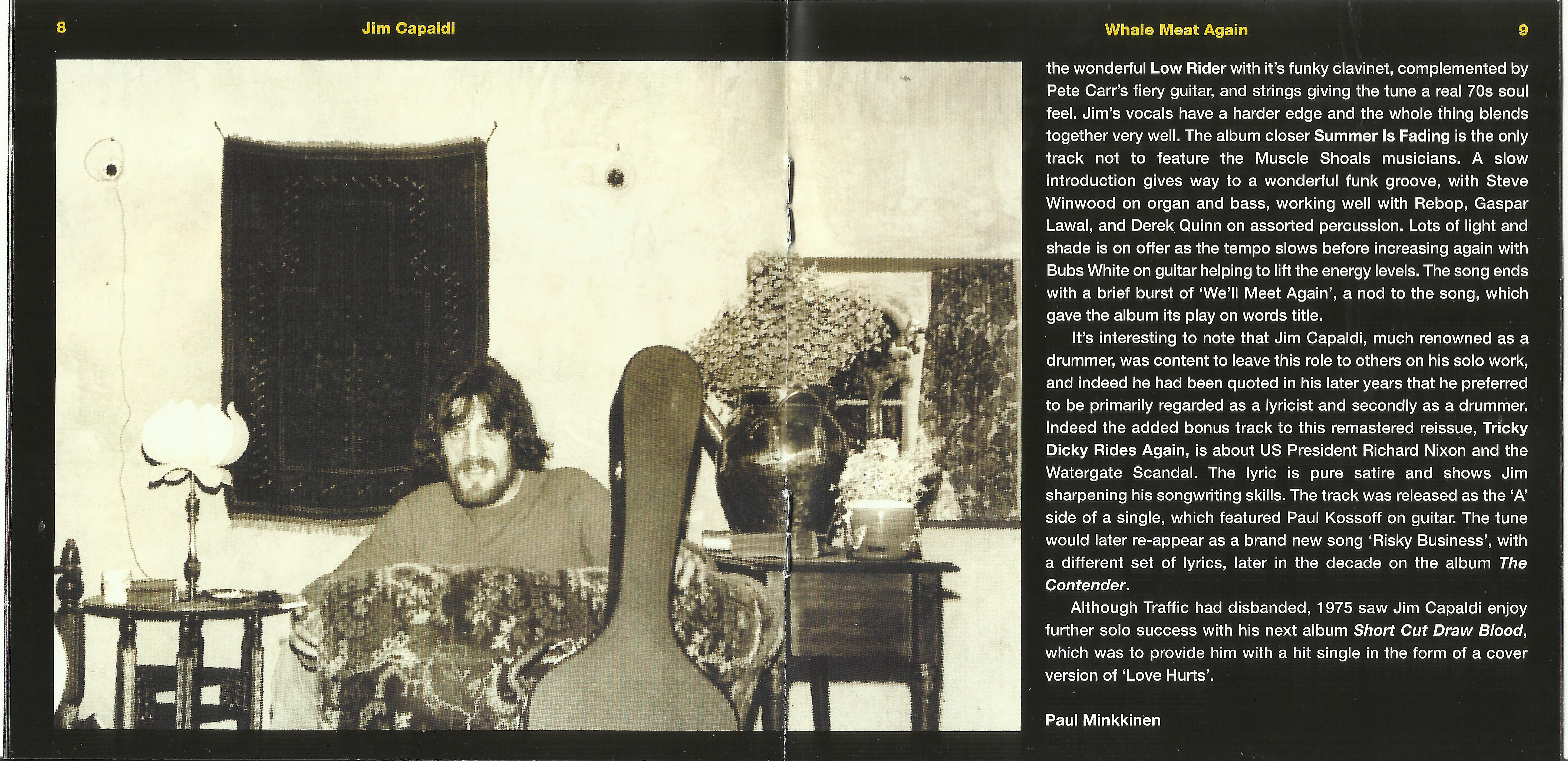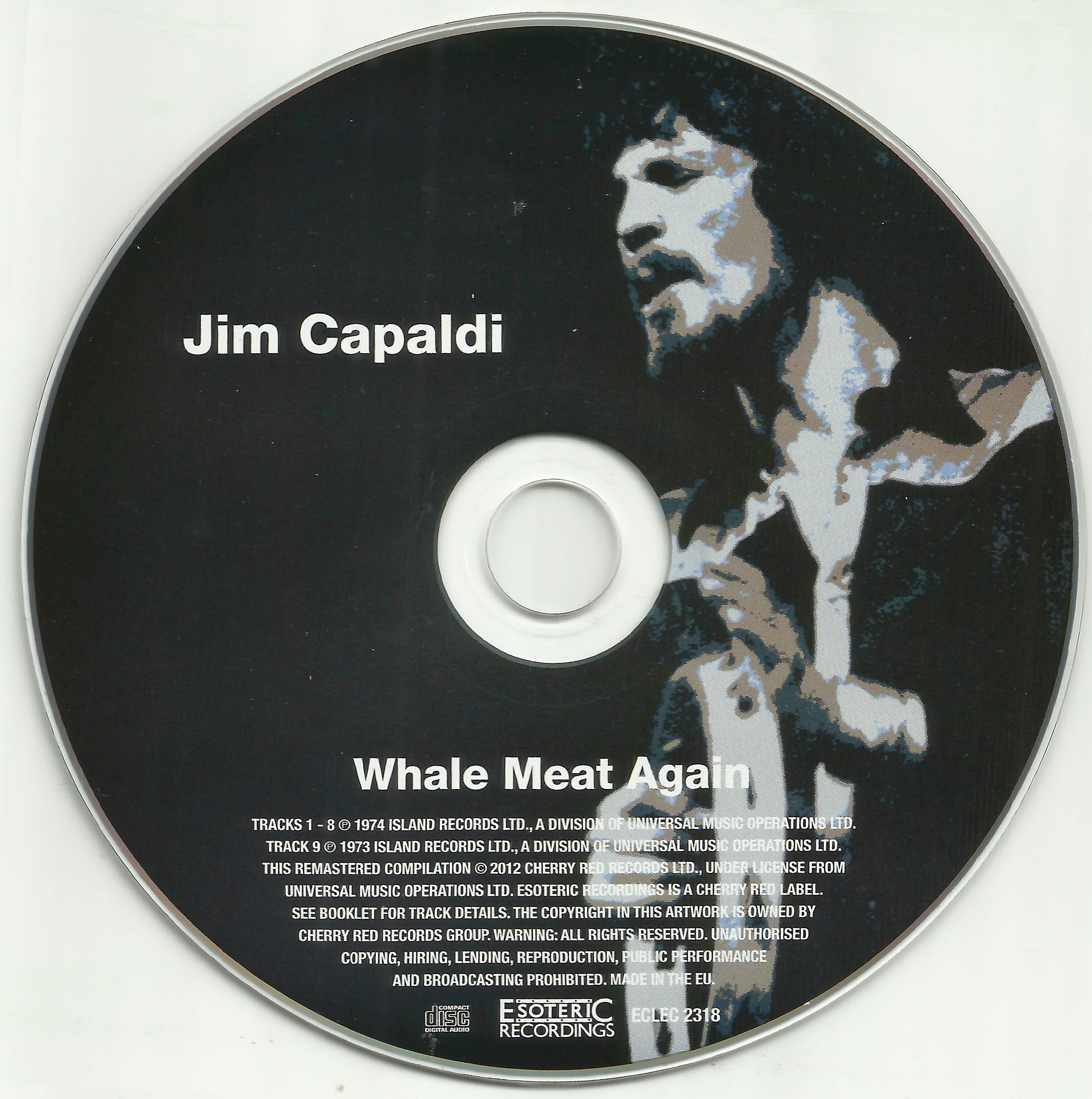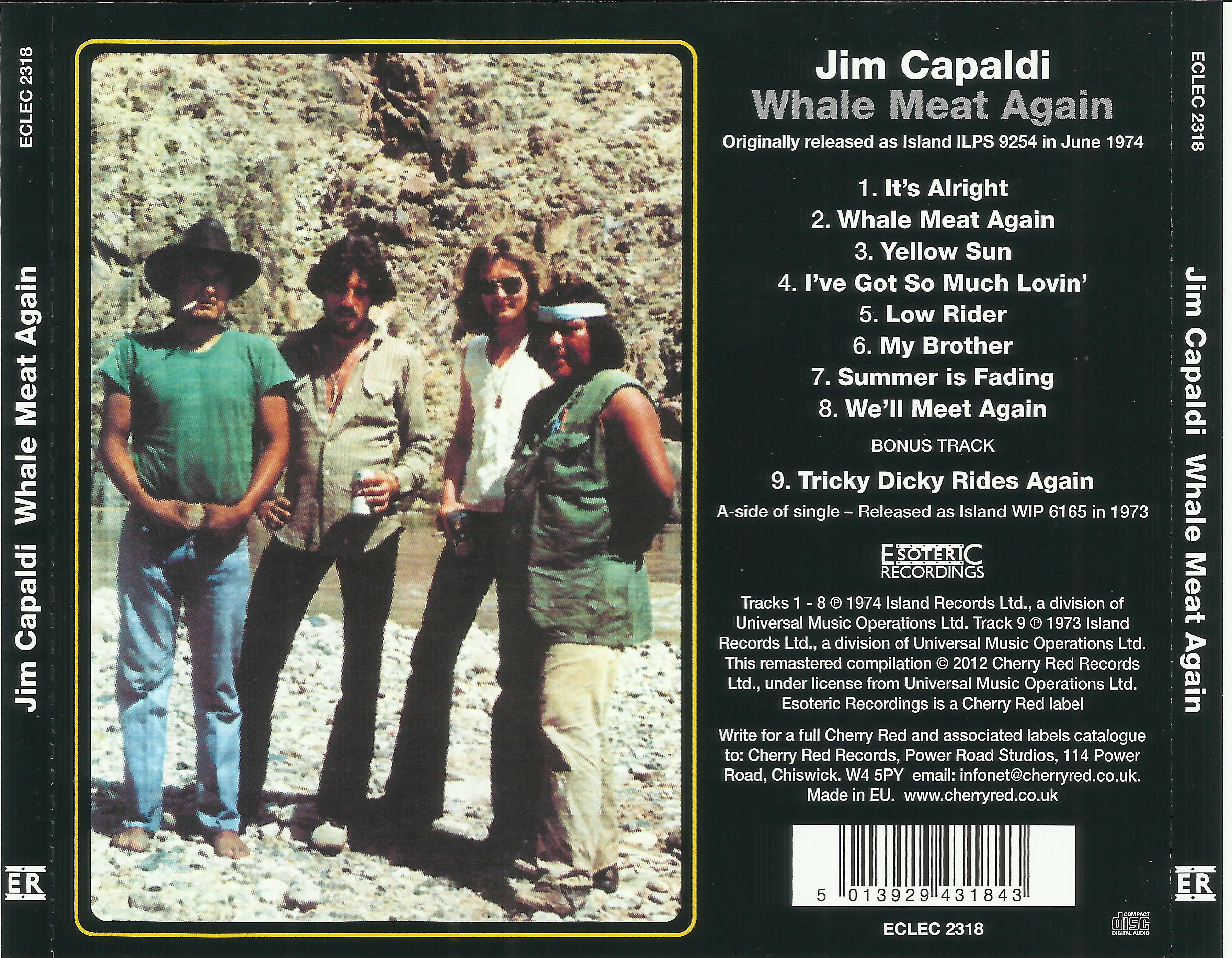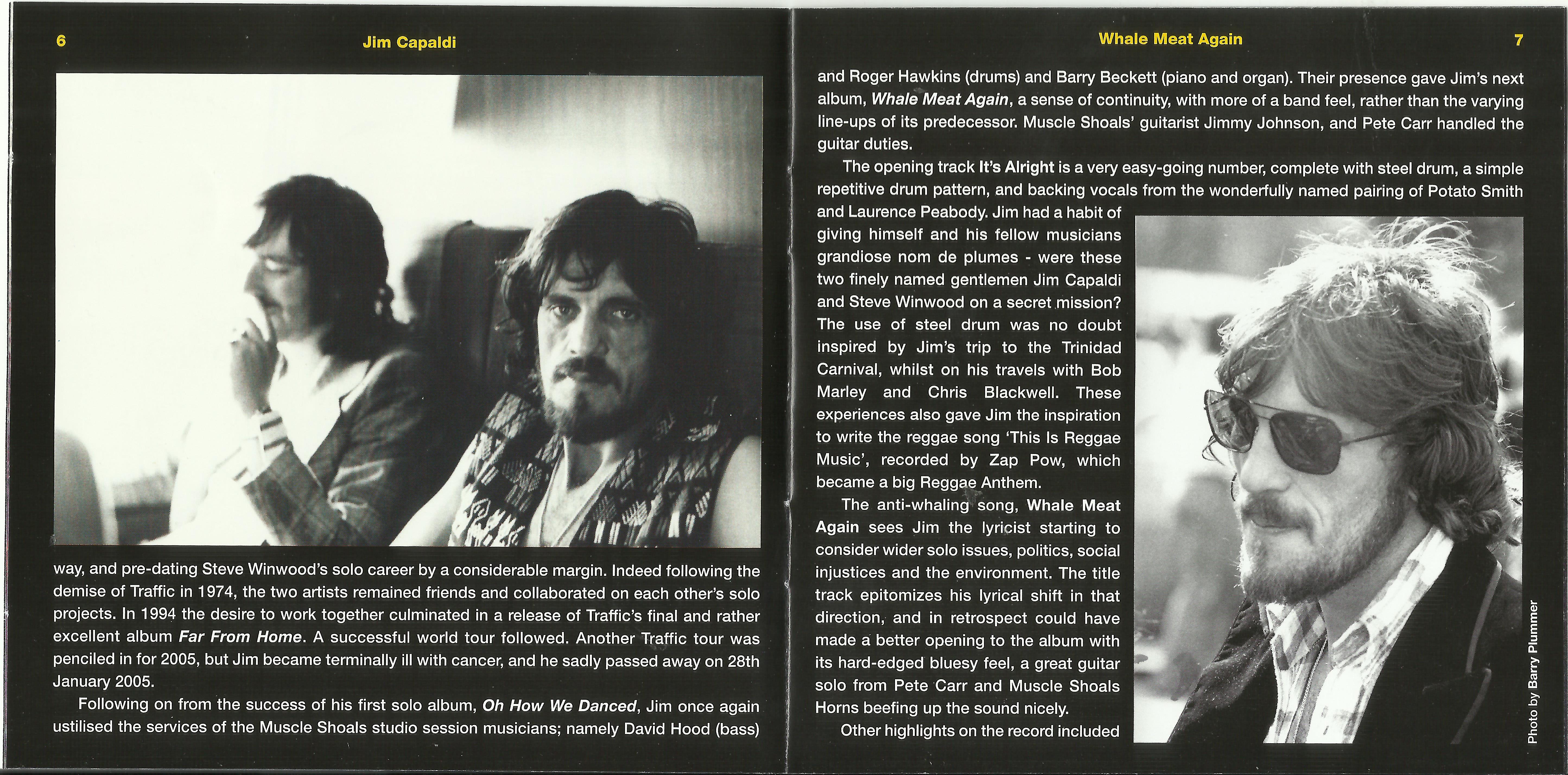 Label : Esoteric Recordings Release Date : June 1974 / March 26, 2012 (reissue) Length : 47:13 Review (AllMusic) : Whale Meat Again, Jim Capaldi's second solo album, appeared in 1974, just before Traffic released their final album, When the Eagle Flies, and while it, like Oh How We Danced before it, has appearances from his Traffic colleagues Steve Winwood and Rebop Kwaku Baah, it feels like a break from his band in ways that his debut never did. True, it's not a drastic break, but where Traffic was getting jazzier with each album, Capaldi kept things down to earth, relying heavily on the blues whether it was in the Plastic Ono grind of the title track, or in the sighing dobros of "Yellow Sun," a lengthy jam that's all about groove, not what's being played. Oh How We Danced also maintained a groovy, mellow feel but the emphasis there was clearly on the songs, and here it's more about mood: not the instrumental interplay, but ratcheting up the soulfulness in the performances and singing, giving this album a funkier, open feel that lingers longer than the songs. Review (Progrography) : This was the first Jim Capaldi album I ever owned and, truth be told, I didn’t dig it much at first. I filed it somewhere between John Lennon’s Walls and Bridges and Ringo’s “with a lot of help from my friends” albums, but without the magical mystery of The Beatles. Since then, however, I’ve done a lot more digging in the latter-day Traffic albums and Capaldi’s first album looking for something of value, and find that none of them deliver the goods quite so much as Whale Meat Again. Recorded between Traffic albums and once more featuring the Muscle Shoals band, Capaldi’s second album is structured very similar to his first; “It’s All Right” even sounds like a breezy version of “Eve.” Whale Meat Again also feels like a weightier record. The seven-minute “Yellow Sun” and eight-minute “Summer Is Fading” invite comparison to Traffic’s longer tracks, while songs like “Low Rider” and “Whale Meat Again” return to Capaldi’s dark lyrical haunts (i.e., no bad/sad couplets here). The vocals on this album are better too, channeling John Lennon on “My Brother” and “Whale Meat Again” (the title track always reminds me a little of “Woman is the Nigger of the World”). Missing here is the scorching lead guitar work of Paul Kossoff and Dave Mason, replaced by the in-house artistry of the Muscle Shoals Rhythm Section’s Pete Carr and Jimmy Johnson. It could be Kossoff and Mason that tilt critics in favor of Capaldi’s first record, but I’d argue that his second is stronger. It’s also a nicely packaged record, with an illustrated lyric sleeve that recalls Elton John’s Goodbye Yellow Brick Road. Review (Rockastaria) : Jim Capaldi's second solo album was recorded virtually simultaneously with Traffic's final album of the 1970s, Where The Eagle Flies. Indeed, it may have even arisen as a result of the long genesis of that album which took over a year to record, saw percussionist Rebop Kwaku Baah being fired midway through the sessions and the band seeming to lose a sense of direction and even purpose. The awfully punned Whale Meat Again was prefaced by a non album single, Tricky Dicky Rides Again released in 1973 as a reaction to the political mess of the Richard Nixon Watergate scandal. More of a 'leftover' from the first solo album - indeed the title track of that album was the b-side of the single - the song features Paul Kossof on guitar (nice solo!) with prominent presence of the Muscle Shoals Horns and some strange sounding Mellotron. A very satirical comment that would have been lost to obscurity (even though Capaldi later revisited the song writing new lyrics and renaming it Risky Business for inclusion on 1978's The Contender album) if Esoteric hadn't resurrected it for inclusion as a bonus track to this release. For the new album Capaldi largely eschewed inviting contributions from guest musicians being content to rely on the core unit of Muscle Shoals session musicians David Hood (bass), Roger Hawkins (drums), Barry Beckett (piano and organ), Jimmy Johnson and Pete Carr (guitars) with the inevitable Muscle Shoals Horns. Opening number It's Alright is rather a misleading song as to the style of the album being a sedate, easy going number with a light reggae feel, including a steel drum, no doubt influenced by Capaldi's friendship with Bob Marley to whom he was introduced by Island Records founder Chris Blackwell. I suppose it is an okay song, rather inoffensive but neither one thing or another and something that I would have thought would have been better placed as a single b-side than an album opener. The title track is a totally different kettle of fish, or given the subject, should that be 'breed of mammal'? An anti-whaling song with a hard edged bitterness, superlative playing from Pete Carr and The Horns producing some of their most definitive and characteristic contributions. However, it is on the lyrics where Capaldi excels: Whale meat again, under the sun, every twelve minutes and another one’s gone. His meat is in your make up, his flesh is on your lips, as a nuclear warhead explodes in his hips. Harry Robinson is drafted in once again to provide the string arrangement on the soulful ballad Yellow Sun. Carr's dobro slide guitar provides an Americana feel with a fine lead vocal by Capaldi and backing vocals from the pseudonymous Potato Smith and Laurence Peabody - speculated as being Capaldi and Winwood, although I have my doubts. The song is typical of the era but with a graceful melody it passes muster. I've Got So Much Lovin' features some marvellous female backing vocals, which sadly go uncredited in the booklet, but sounds very like it may be the prolific backing singers Irene and Doreen Chanter who, along with Liza Strike, enhanced so many records from the 1970s. The expansive sax gives the number a sleazier feel but overall the energy and 