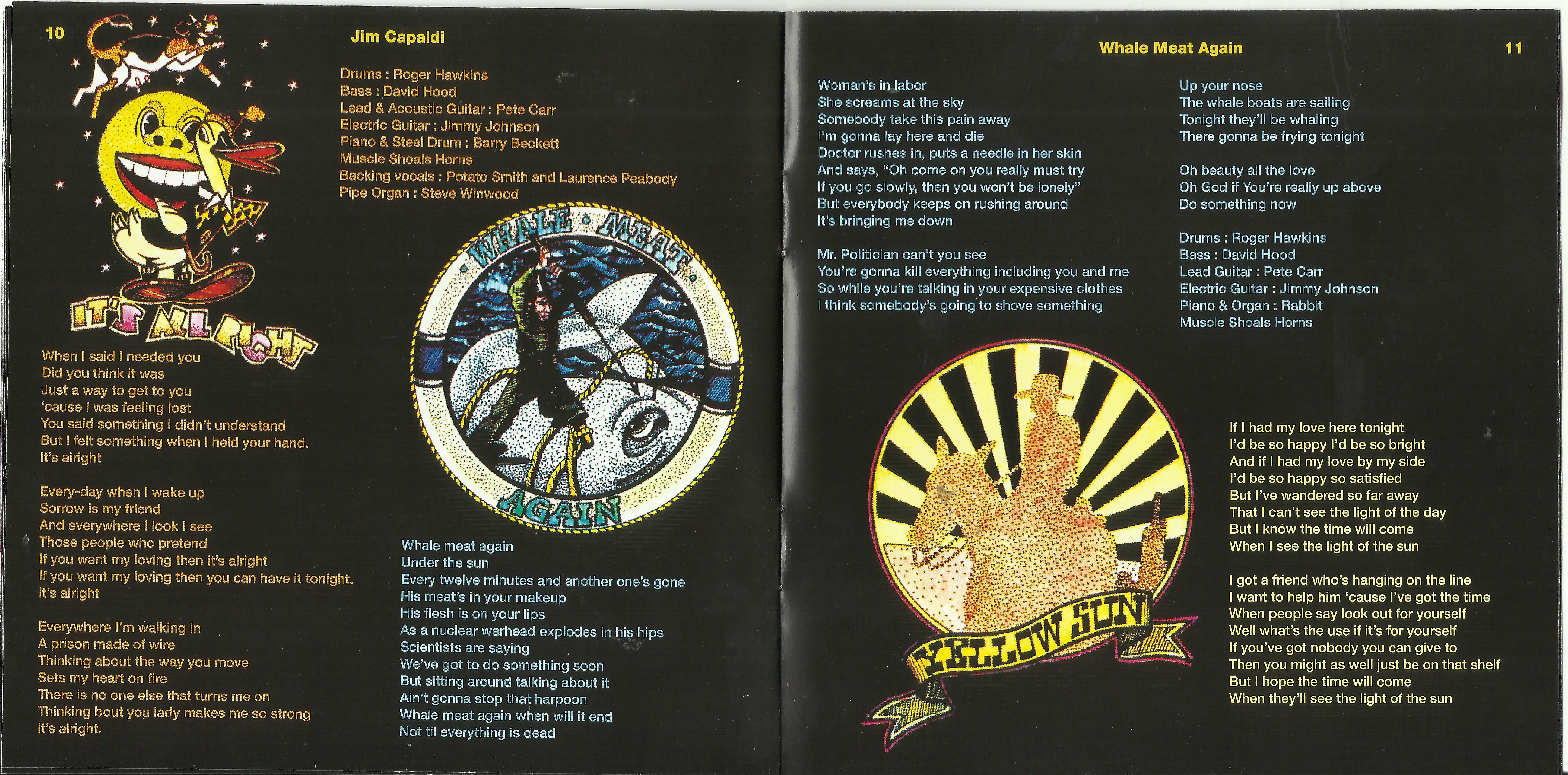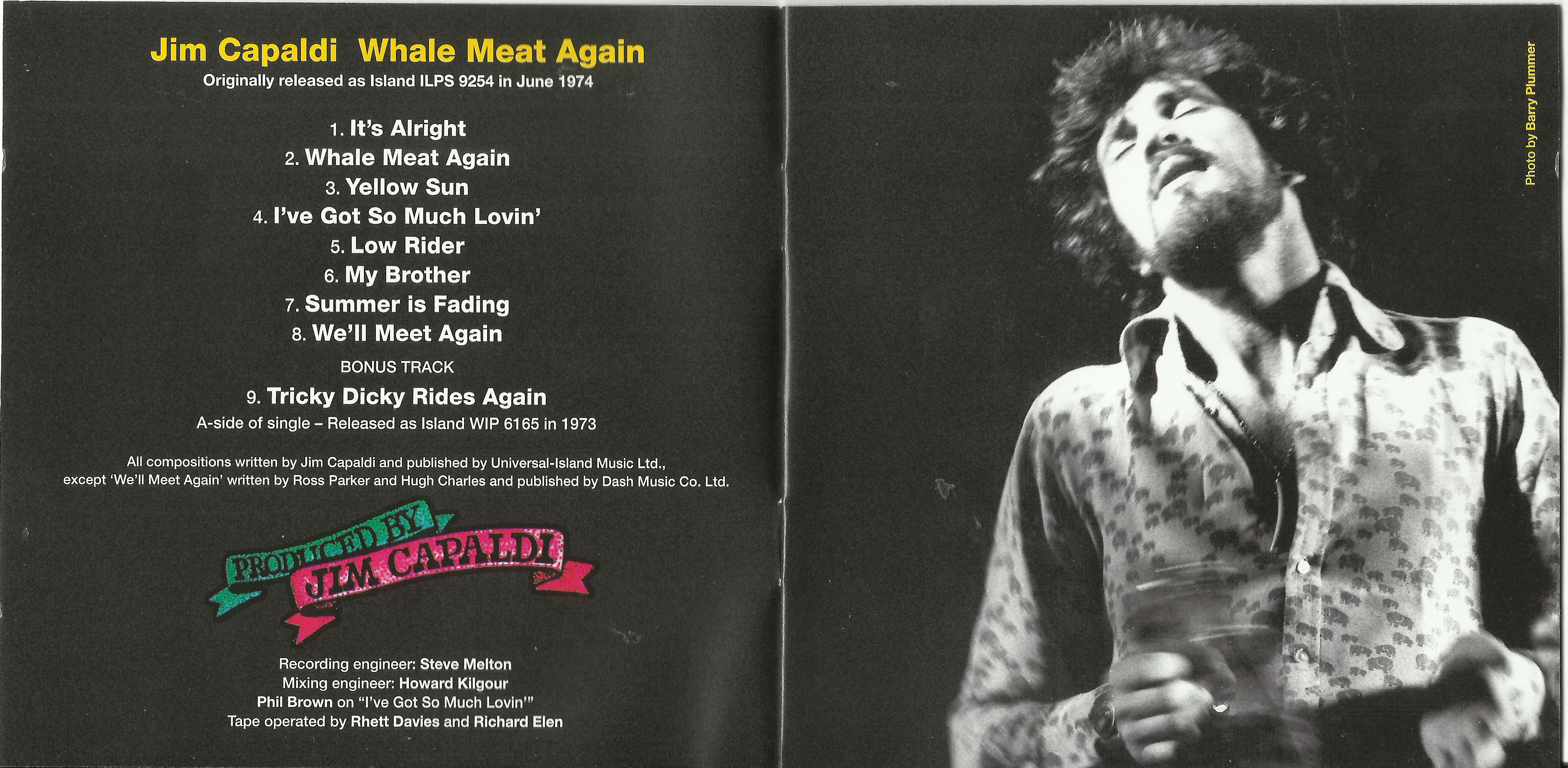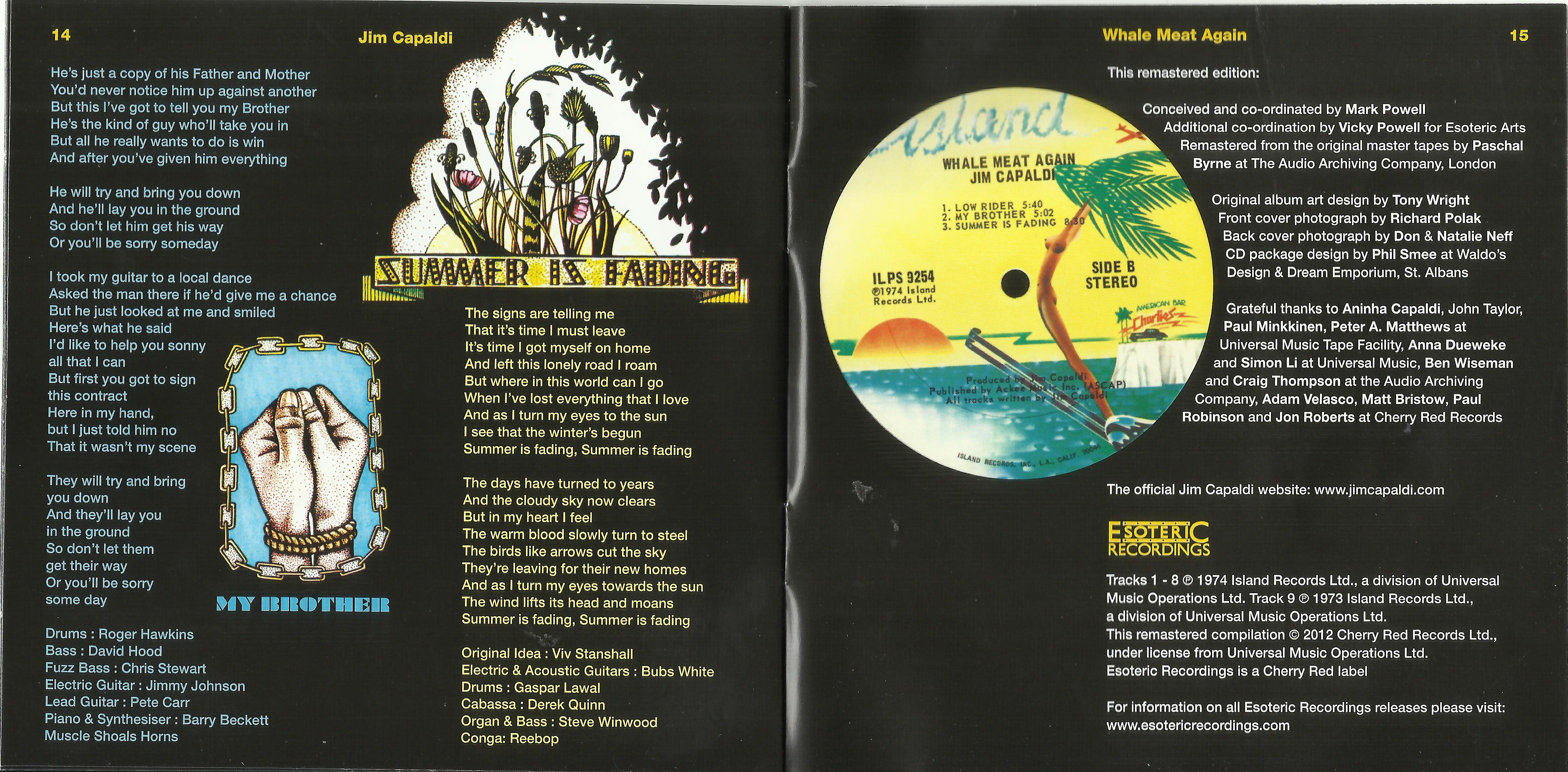 Label : Esoteric Recordings Release Date : June 1974 / March 26, 2012 (reissue) Length : 47:13 Review (AllMusic) : Whale Meat Again, Jim Capaldi's second solo album, appeared in 1974, just before Traffic released their final album, When the Eagle Flies, and while it, like Oh How We Danced before it, has appearances from his Traffic colleagues Steve Winwood and Rebop Kwaku Baah, it feels like a break from his band in ways that his debut never did. True, it's not a drastic break, but where Traffic was getting jazzier with each album, Capaldi kept things down to earth, relying heavily on the blues whether it was in the Plastic Ono grind of the title track, or in the sighing dobros of "Yellow Sun," a lengthy jam that's all about groove, not what's being played. Oh How We Danced also maintained a groovy, mellow feel but the emphasis there was clearly on the songs, and here it's more about mood: not the instrumental interplay, but ratcheting up the soulfulness in the performances and singing, giving this album a funkier, open feel that lingers longer than the songs. Review (Progrography) : This was the first Jim Capaldi album I ever owned and, truth be told, I didn’t dig it much at first. I filed it somewhere between John Lennon’s Walls and Bridges and Ringo’s “with a lot of help from my friends” albums, but without the magical mystery of The Beatles. Since then, however, I’ve done a lot more digging in the latter-day Traffic albums and Capaldi’s first album looking for something of value, and find that none of them deliver the goods quite so much as Whale Meat Again. Recorded between Traffic albums and once more featuring the Muscle Shoals band, Capaldi’s second album is structured very similar to his first; “It’s All Right” even sounds like a breezy version of “Eve.” Whale Meat Again also feels like a weightier record. The seven-minute “Yellow Sun” and eight-minute “Summer Is Fading” invite comparison to Traffic’s longer tracks, while songs like “Low Rider” and “Whale Meat Again” return to Capaldi’s dark lyrical haunts (i.e., no bad/sad couplets here). The vocals on this album are better too, channeling John Lennon on “My Brother” and “Whale Meat Again” (the title track always reminds me a little of “Woman is the Nigger of the World”). Missing here is the scorching lead guitar work of Paul Kossoff and Dave Mason, replaced by the in-house artistry of the Muscle Shoals Rhythm Section’s Pete Carr and Jimmy Johnson. It could be Kossoff and Mason that tilt critics in favor of Capaldi’s first record, but I’d argue that his second is stronger. It’s also a nicely packaged record, with an illustrated lyric sleeve that recalls Elton John’s Goodbye Yellow Brick Road. Review (Rockastaria) : Jim Capaldi's second solo album was recorded virtually simultaneously with Traffic's final album of the 1970s, Where The Eagle Flies. Indeed, it may have even arisen as a result of the long genesis of that album which took over a year to record, saw percussionist Rebop Kwaku Baah being fired midway through the sessions and the band seeming to lose a sense of direction and even purpose. The awfully punned Whale Meat Again was prefaced by a non album single, Tricky Dicky Rides Again released in 1973 as a reaction to the political mess of the Richard Nixon Watergate scandal. More of a 'leftover' from the first solo album - indeed the title track of that album was the b-side of the single - the song features Paul Kossof on guitar (nice solo!) with prominent presence of the Muscle Shoals Horns and some strange sounding Mellotron. A very satirical comment that would have been lost to obscurity (even though Capaldi later revisited the song writing new lyrics and renaming it Risky Business for inclusion on 1978's The Contender album) if Esoteric hadn't resurrected it for inclusion as a bonus track to this release. For the new album Capaldi largely eschewed inviting contributions from guest musicians being content to rely on the core unit of Muscle Shoals session musicians David Hood (bass), Roger Hawkins (drums), Barry Beckett (piano and organ), Jimmy Johnson and Pete Carr (guitars) with the inevitable Muscle Shoals Horns. Opening number It's Alright is rather a misleading song as to the style of the album being a sedate, easy going number with a light reggae feel, including a steel drum, no doubt influenced by Capaldi's friendship with Bob Marley to whom he was introduced by Island Records founder Chris Blackwell. I suppose it is an okay song, rather inoffensive but neither one thing or another and something that I would have thought would have been better placed as a single b-side than an album opener. The title track is a totally different kettle of fish, or given the subject, should that be 'breed of mammal'? An anti-whaling song with a hard edged bitterness, superlative playing from Pete Carr and The Horns producing some of their most definitive and characteristic contributions. However, it is on the lyrics where Capaldi excels: Whale meat again, under the sun, every twelve minutes and another one’s gone. His meat is in your make up, his flesh is on your lips, as a nuclear warhead explodes in his hips. Harry Robinson is drafted in once again to provide the string arrangement on the soulful ballad Yellow Sun. Carr's dobro slide guitar provides an Americana feel with a fine lead vocal by Capaldi and backing vocals from the pseudonymous Potato Smith and Laurence Peabody - speculated as being Capaldi and Winwood, although I have my doubts. The song is typical of the era but with a graceful melody it passes muster. I've Got So Much Lovin' features some marvellous female backing vocals, which sadly go uncredited in the booklet, but sounds very like it may be the prolific backing singers Irene and Doreen Chanter who, along with Liza Strike, enhanced so many records from the 1970s. The expansive sax gives the number a sleazier feel but overall the energy and 