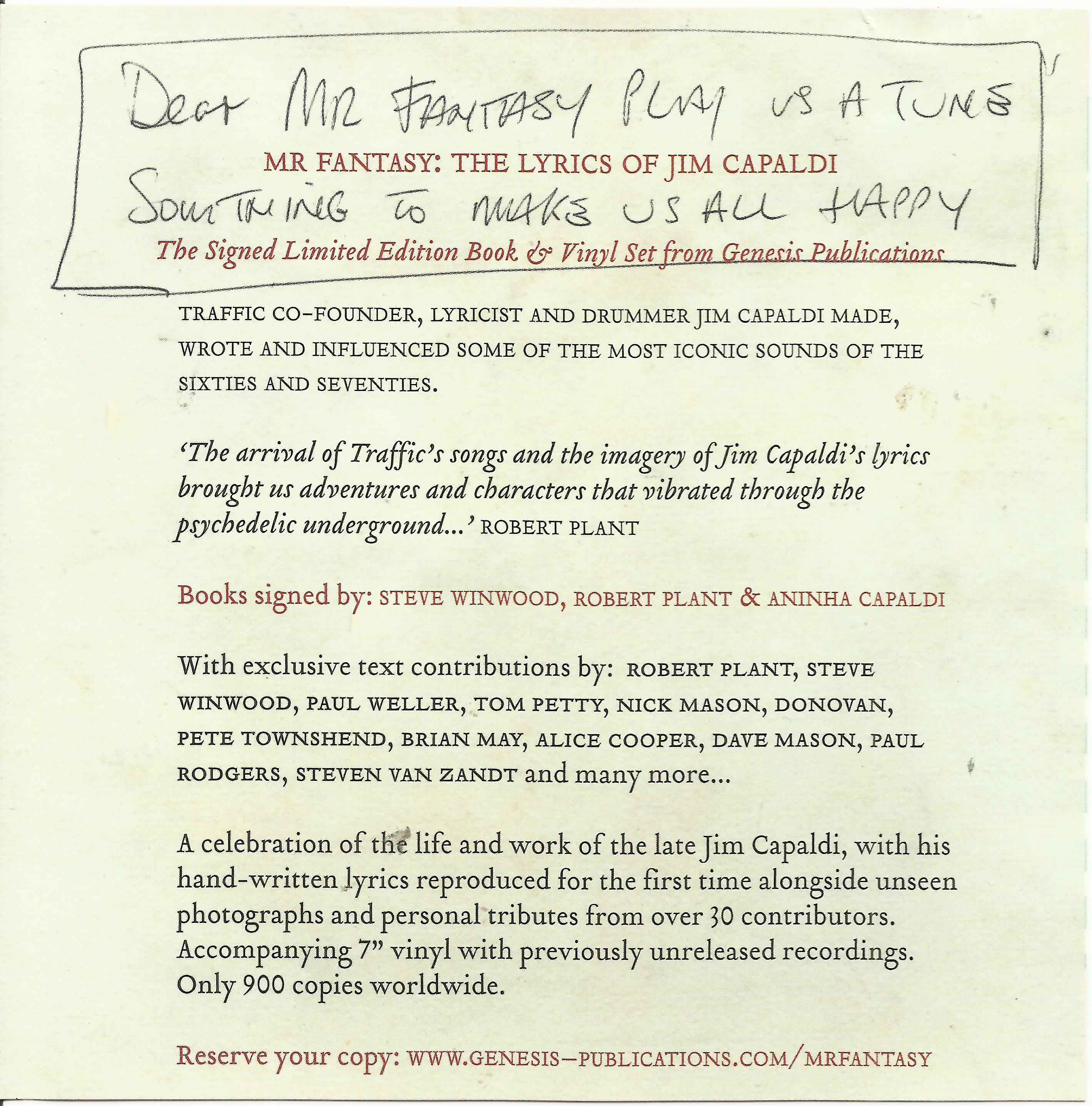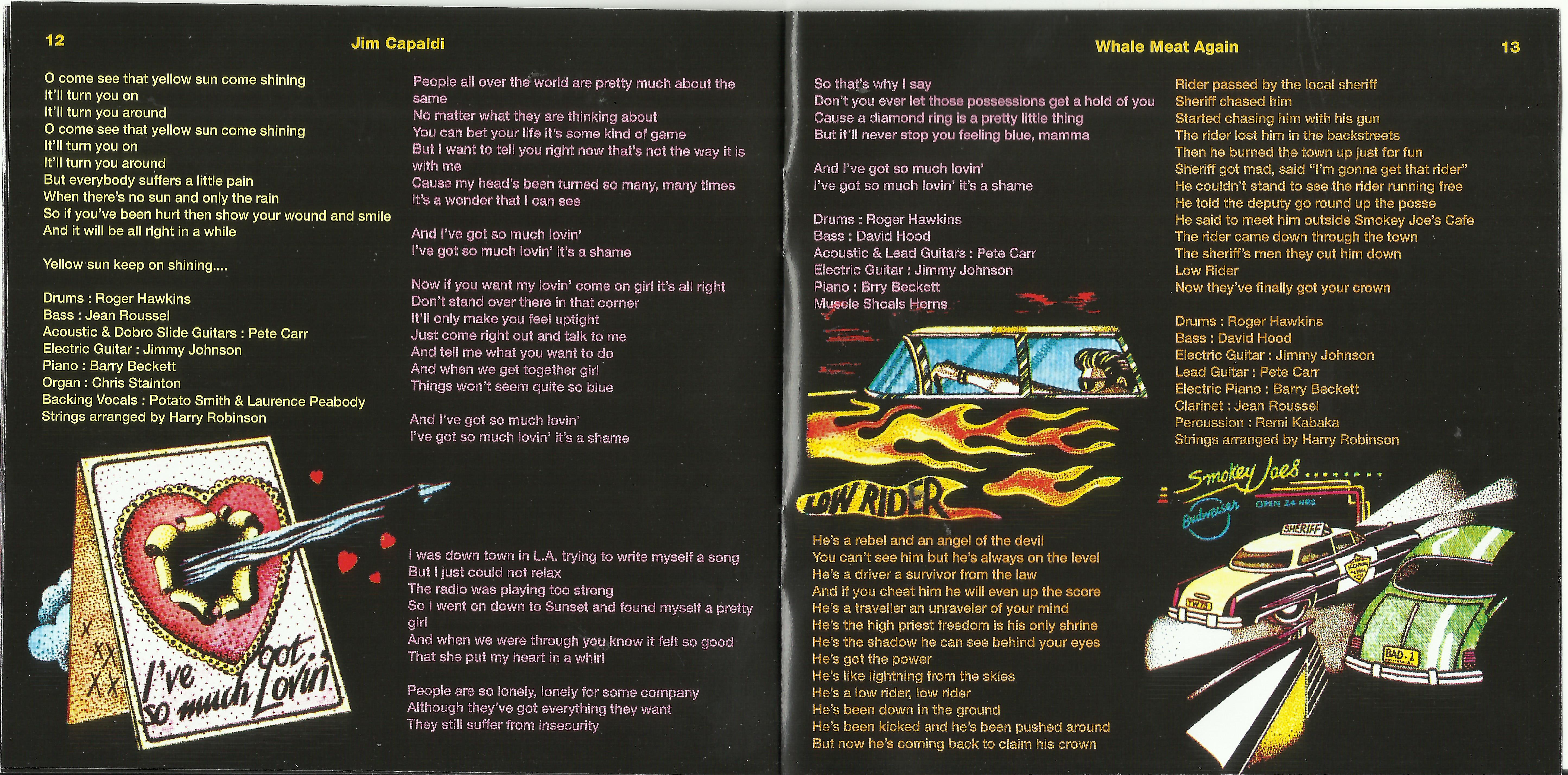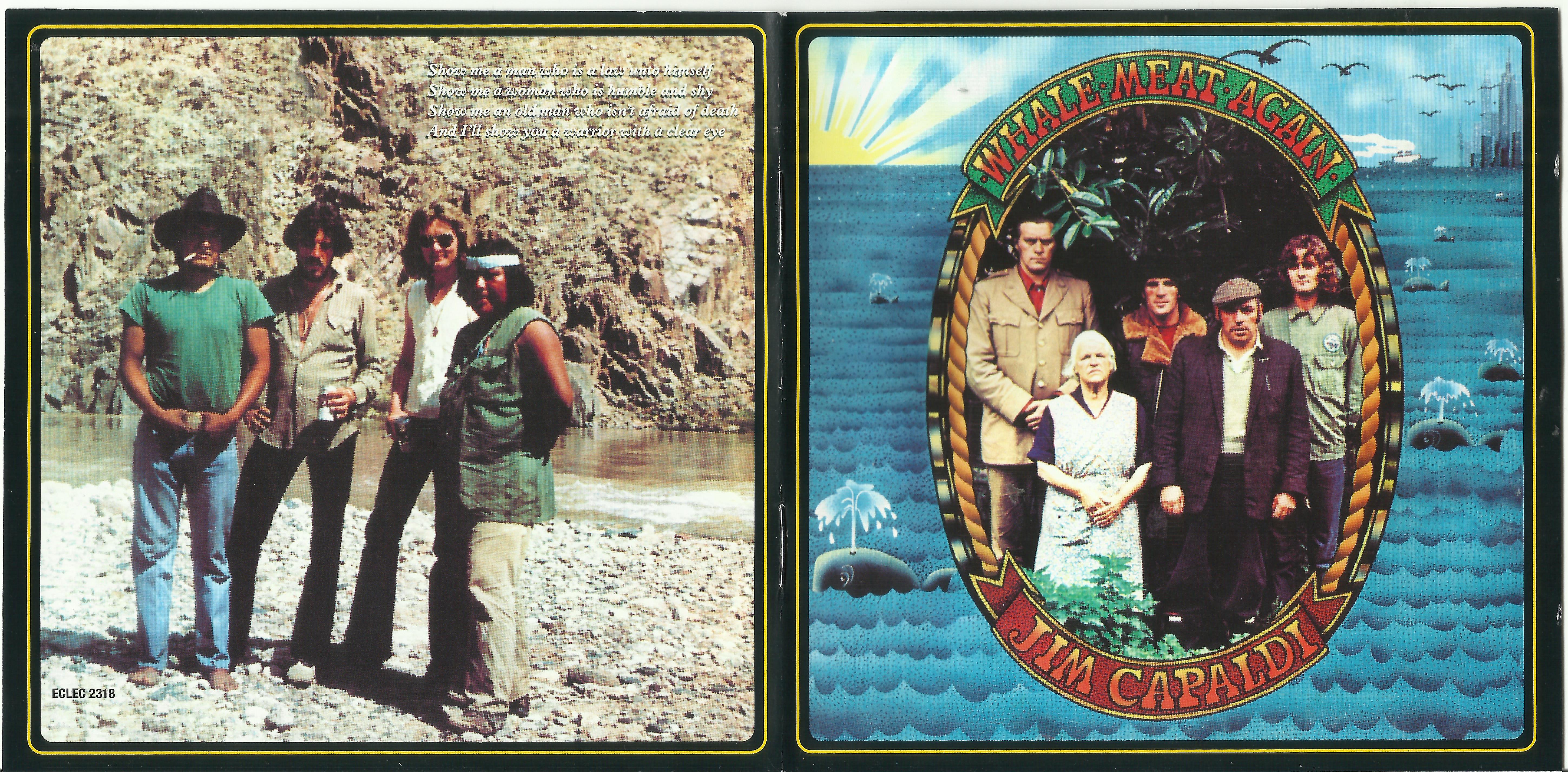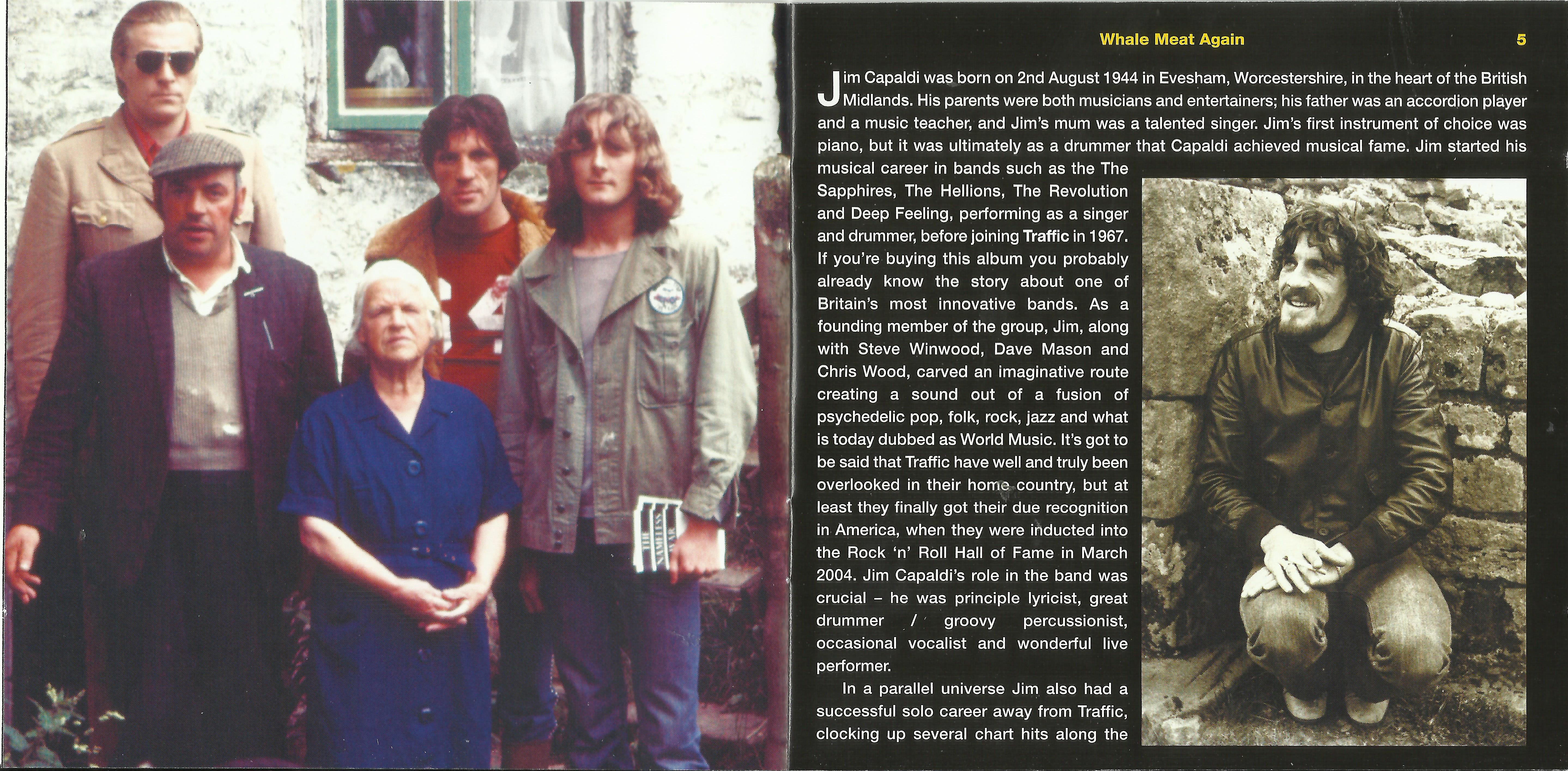 Label : Esoteric Recordings Release Date : June 1974 / March 26, 2012 (reissue) Length : 47:13 Review (AllMusic) : Whale Meat Again, Jim Capaldi's second solo album, appeared in 1974, just before Traffic released their final album, When the Eagle Flies, and while it, like Oh How We Danced before it, has appearances from his Traffic colleagues Steve Winwood and Rebop Kwaku Baah, it feels like a break from his band in ways that his debut never did. True, it's not a drastic break, but where Traffic was getting jazzier with each album, Capaldi kept things down to earth, relying heavily on the blues whether it was in the Plastic Ono grind of the title track, or in the sighing dobros of "Yellow Sun," a lengthy jam that's all about groove, not what's being played. Oh How We Danced also maintained a groovy, mellow feel but the emphasis there was clearly on the songs, and here it's more about mood: not the instrumental interplay, but ratcheting up the soulfulness in the performances and singing, giving this album a funkier, open feel that lingers longer than the songs. Review (Progrography) : This was the first Jim Capaldi album I ever owned and, truth be told, I didn’t dig it much at first. I filed it somewhere between John Lennon’s Walls and Bridges and Ringo’s “with a lot of help from my friends” albums, but without the magical mystery of The Beatles. Since then, however, I’ve done a lot more digging in the latter-day Traffic albums and Capaldi’s first album looking for something of value, and find that none of them deliver the goods quite so much as Whale Meat Again. Recorded between Traffic albums and once more featuring the Muscle Shoals band, Capaldi’s second album is structured very similar to his first; “It’s All Right” even sounds like a breezy version of “Eve.” Whale Meat Again also feels like a weightier record. The seven-minute “Yellow Sun” and eight-minute “Summer Is Fading” invite comparison to Traffic’s longer tracks, while songs like “Low Rider” and “Whale Meat Again” return to Capaldi’s dark lyrical haunts (i.e., no bad/sad couplets here). The vocals on this album are better too, channeling John Lennon on “My Brother” and “Whale Meat Again” (the title track always reminds me a little of “Woman is the Nigger of the World”). Missing here is the scorching lead guitar work of Paul Kossoff and Dave Mason, replaced by the in-house artistry of the Muscle Shoals Rhythm Section’s Pete Carr and Jimmy Johnson. It could be Kossoff and Mason that tilt critics in favor of Capaldi’s first record, but I’d argue that his second is stronger. It’s also a nicely packaged record, with an illustrated lyric sleeve that recalls Elton John’s Goodbye Yellow Brick Road. Review (Rockastaria) : Jim Capaldi's second solo album was recorded virtually simultaneously with Traffic's final album of the 1970s, Where The Eagle Flies. Indeed, it may have even arisen as a result of the long genesis of that album which took over a year to record, saw percussionist Rebop Kwaku Baah being fired midway through the sessions and the band seeming to lose a sense of direction and even purpose. The awfully punned Whale Meat Again was prefaced by a non album single, Tricky Dicky Rides Again released in 1973 as a reaction to the political mess of the Richard Nixon Watergate scandal. More of a 'leftover' from the first solo album - indeed the title track of that album was the b-side of the single - the song features Paul Kossof on guitar (nice solo!) with prominent presence of the Muscle Shoals Horns and some strange sounding Mellotron. A very satirical comment that would have been lost to obscurity (even though Capaldi later revisited the song writing new lyrics and renaming it Risky Business for inclusion on 1978's The Contender album) if Esoteric hadn't resurrected it for inclusion as a bonus track to this release. For the new album Capaldi largely eschewed inviting contributions from guest musicians being content to rely on the core unit of Muscle Shoals session musicians David Hood (bass), Roger Hawkins (drums), Barry Beckett (piano and organ), Jimmy Johnson and Pete Carr (guitars) with the inevitable Muscle Shoals Horns. Opening number It's Alright is rather a misleading song as to the style of the album being a sedate, easy going number with a light reggae feel, including a steel drum, no doubt influenced by Capaldi's friendship with Bob Marley to whom he was introduced by Island Records founder Chris Blackwell. I suppose it is an okay song, rather inoffensive but neither one thing or another and something that I would have thought would have been better placed as a single b-side than an album opener. The title track is a totally different kettle of fish, or given the subject, should that be 'breed of mammal'? An anti-whaling song with a hard edged bitterness, superlative playing from Pete Carr and The Horns producing some of their most definitive and characteristic contributions. However, it is on the lyrics where Capaldi excels: Whale meat again, under the sun, every twelve minutes and another one’s gone. His meat is in your make up, his flesh is on your lips, as a nuclear warhead explodes in his hips. Harry Robinson is drafted in once again to provide the string arrangement on the soulful ballad Yellow Sun. Carr's dobro slide guitar provides an Americana feel with a fine lead vocal by Capaldi and backing vocals from the pseudonymous Potato Smith and Laurence Peabody - speculated as being Capaldi and Winwood, although I have my doubts. The song is typical of the era but with a graceful melody it passes muster. I've Got So Much Lovin' features some marvellous female backing vocals, which sadly go uncredited in the booklet, but sounds very like it may be the prolific backing singers Irene and Doreen Chanter who, along with Liza Strike, enhanced so many records from the 1970s. The expansive sax gives the number a sleazier feel but overall the energy and 