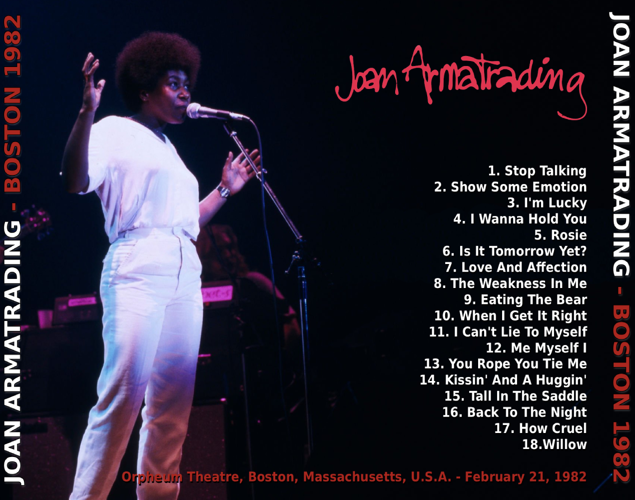 Label : no label Venue : Orpheum Theatre, Boston, Massachusetts, USA Recording Date : February 21, 1982 Length : 86:09 Quality : FM Recording (A+) Review : Excellent FM broadcast recording of Joan Armatrading and band, promoting her 7th album "Walk Under Ladders". Line-up : Joan Armatrading: guitar, vocals. Gary Sanford: lead guitar. Jeremy Meek: bass. Dean Klevatt: keyboards. Justin Hildreth: drums. Julian Diggle: percussion. |