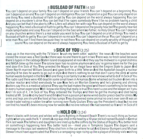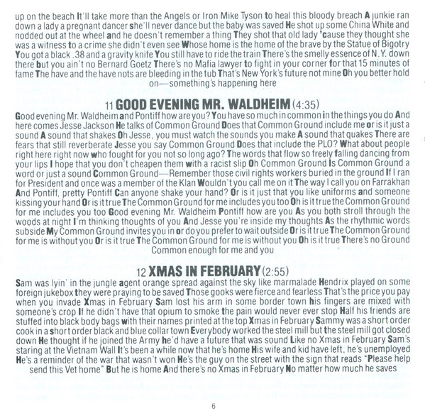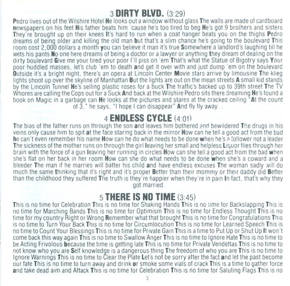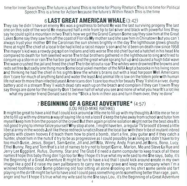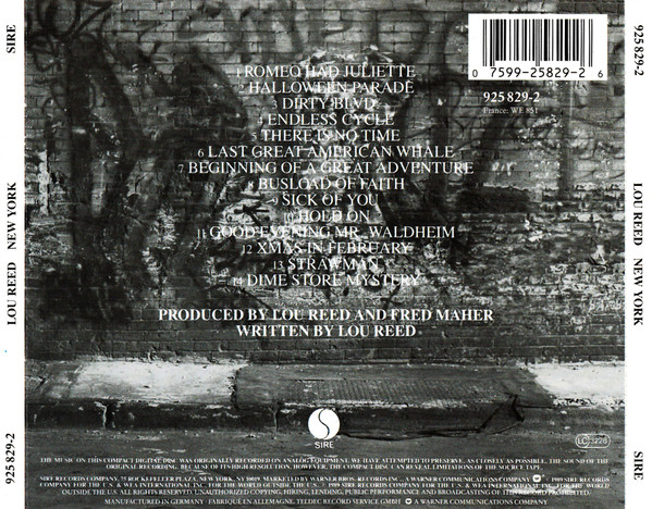 Label : Sire Release Date : January 10, 1989 Length : 56:55 Review (AllMusic) : If the city of New York didn't exist, Lou Reed would have had to invent it in order to create a suitable environment for himself, a place where high art and street-level rock & roll stand side by side. New York figured so prominently in Reed's music, it's surprising it took him until 1989 to make an album simply called New York, a set of 14 scenes and sketches from the city that was his spiritual home. As a songwriter, New York is the strongest and best-realized set of songs in Reed's solo catalog; while his superb 1982 comeback The Blue Mask sometimes found him reaching for his effects, New York's accumulated details and deftly drawn caricatures hit bull's-eye after bull's-eye for 57 minutes, all with an easy stride and striking lyrical facility. New York also found Reed writing about the larger world rather than personal concerns for a change, and in the beautiful, decaying heart of New York City, he found plenty to talk about -- the devastating impact of AIDS in "Halloween Parade," the vicious circle of child abuse in "Endless Cycle," the plight of the homeless in "Xmas in February." Even on the songs where he pointedly mounts a soapbox ("There Is No Time," "Hold On," and "Good Evening Mr. Waldheim"), he does so with a down-to-earth intelligence and smart-assed wit that makes him sound opinionated rather than preachy; the specific details of his rants may have faded into memory a few decades later, but the essential themes still ring true. When Reed looks into his own life, it's with humor and perception; "Beginning of a Great Adventure" is a hilarious meditation on the possibilities of parenthood, and "Dime Store Mystery" is a moving elegy to his former patron Andy Warhol. Reed introduced a new band on this set, and though guitarist Mike Rathke didn't challenge him the way Robert Quine did, he didn't need much prodding to play at the peak of his game, and Rob Wasserman's fluid, inventive bass and Fred Maher's precise drumming are strong, smart, and rock hard. Produced with subtle intelligence and a welcome absence of flash, New York is a masterpiece of literate, adult rock & roll, and the finest album of Lou Reed's solo career. |