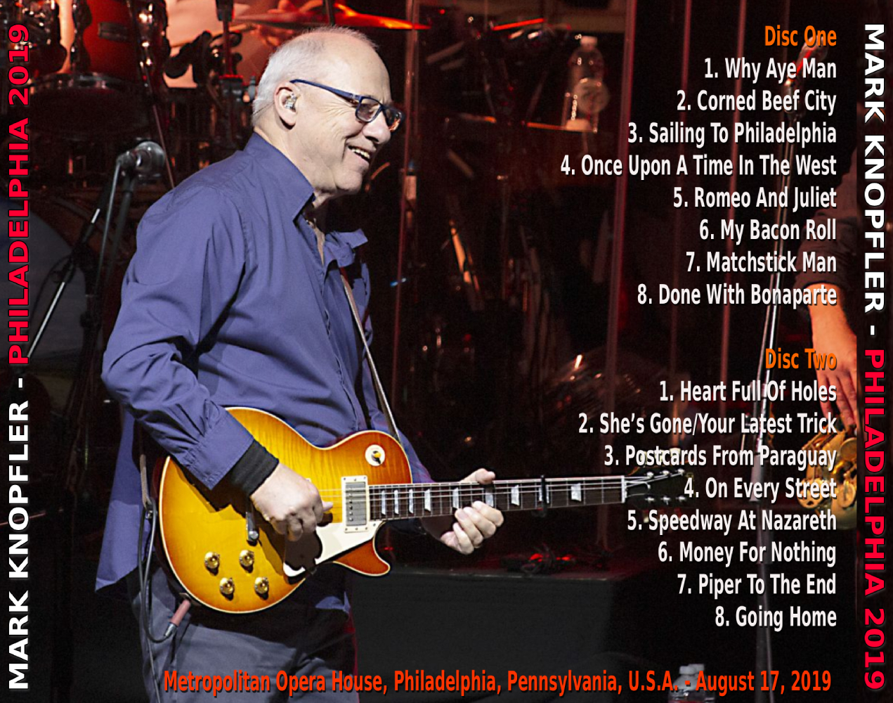 Label : MarkKnopfler.com Venue : Metropolitan Opera House, Philadelphia, Pennsylvania, USA Recording Date : August 17, 2019 Quality : Soundboard recording (A+) Review : Professional recording made by the Mark Knopfler crew and sold on his website. Review : Mark Knopfler performed a sold-out concert at The Met Philadelphia on August 17, 2019, as part of his Down the Road Wherever world tour. Reviews described the performance as a masterclass in guitar craftsmanship, though some fans noted a preference for his solo material over the older Dire Straits hits. |
