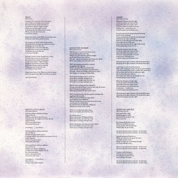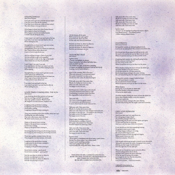 Label : Capitol Records Release Date : August 25, 1986 Length : 45:13 Review (AllMusic) : At the time, Press to Play was occasionally promoted as Macca's response to punk -- which we all better hope is not true, since that means he was responding ten years after the fact, signaling just how out of touch he was. But McCartney wasn't that disconnected from reality (he did talk about punk in interviews from the late '70s), so a more accurate view of Press to Play is to see it as McCartney trying to reconnect with his classic strengths, from orchestral pop and whimsy to driving rockers and sweet love songs. All this is apparent on the record, often in pretty charming fashion. "Stranglehold" has an offhand charm, "Good Times Coming/Feel the Sun" feels like a forgotten Red Rose Speedway medley, "Move Over Busker" has a brisk gait (better than its cousin, "Angry," anyway), and "Press" is a terrific mid-'80s drum machine-driven slice of synth-pop, utterly featherweight in the best possible way. Each of these captures a different side of McCartney, and that's the overriding impression of Press to Play -- McCartney is dabbling in each of his strengths, just to see what works. It doesn't wind up as one of his stronger albums, but it's more interesting than some of his more consistent ones, and those aforementioned cuts demonstrate that he could still cut effective pop records when he put his mind to it. |