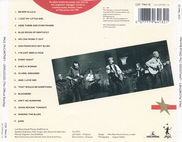 Label : Parlophone Records Venue : Limehouse Studios (The Word), London, UK Recording Date : January 25, 1991 Released : May 20, 1991 Length : 58:33 Review (AllMusic) : Released after the studied, meticulous Flowers in the Dirt, the live acoustic concert album Unplugged was a breath of fresh air, and it remains one of the most enjoyable records in McCartney's catalog. Running through a selection of oldies - not only his own, but Beatles and rock & roll chestnuts - McCartney is carefree and charming, making songs like "Be-Bop-a-Lula" and "Blue Moon of Kentucky" (which finds Paul melding Bill Monroe with Elvis) sound fresh. But the real revelations of the record are the songs McCartney hauls out from his debut - "That Would Be Something," "Every Night," and "Junk" - which sound lovely and timeless, restoring them to their proper place in his canon. They help make Unplugged into a thoroughly enjoyable minor gem. Review (Wikipedia) : Unplugged (The Official Bootleg) is a live unplugged performance by Paul McCartney, recorded and released in 1991. Following the vastness of his world tour recently captured on Tripping the Live Fantastic, McCartney relished the opportunity to strip back his songs and appear on the newly launched acoustic-only show MTV Unplugged. Consequently, McCartney was the first in a long line of artists to release an unplugged album. Unlike other artists who appeared on the acclaimed show with acoustic instruments plugged into amplifiers (producing the sound heard), McCartney's instruments were 100% unplugged. Microphones were carefully placed close to guitars, pianos, etc. to pick up the sound (this can be seen on the album cover, where a large rectangular microphone is pictured in front of McCartney's acoustic guitar). Using the same line-up that had recently backed him (save for Blair Cunningham who had replaced Chris Whitten), McCartney used the opportunity to dust off some of his rarer tracks, including three from his 1970 debut album McCartney, alongside several ../covers and amid a helping of familiar Beatles hits. This recording was one of the first in the famed MTV Unplugged series. Several tracks performed in the show were not included on the album, as follows: "Things We Said Today", "Midnight Special", "Matchbox", "Mean Woman Blues" and "The Fool". Numbers rehearsed by the band but not performed at all include: "Mother Nature's Son", "Figure of Eight", "Cut Across Shorty", "Heartbreak Hotel", "Heart of the Country", "She's My Baby", and "Mrs. Vandebilt". "Things We Said Today" and "Midnight Special" would see official release two years later in 1993 as B-sides to the "Biker Like an Icon" single. With McCartney in a loose and carefree context, critical response to Unplugged (The Official Bootleg) was very warm. Initially released in a limited edition, individually numbered run in 1991, Unplugged (The Official Bootleg)-with artwork that recalls Choba B CCCP's-was reissued in a more permanent fashion in the late 1990s. Upon its original issue, it reached number 7 in the UK and became McCartney's highest-peaking US album in almost ten years, reaching number 14. |