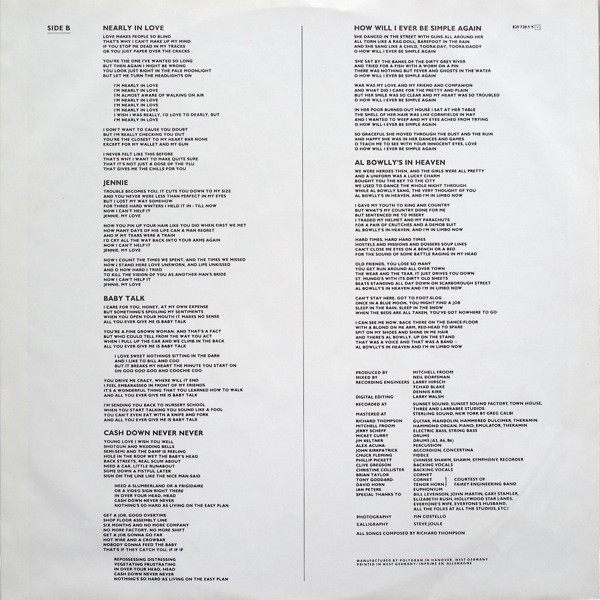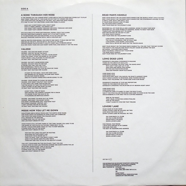 Label : Polydor Release Date : March 1986 Length : 47:06 Review (AllMusic) : In 1986, Richard Thompson and his record label of the moment, Polydor, were eager to expand his audience, so Thompson parted ways with his long-time producer Joe Boyd and went into the studio with producer and keyboard player Mitchell Froom. While Froom's approach was noticeably different than Boyd's, he displayed an obvious respect for Thompson's gifts, and though Daring Adventures boasts a bit more aural sheen than the albums that preceded it, Richard Thompson's style as a guitarist and songwriter still shines through clear as day. Froom replaced Thompson's usual rhythm section with top-shelf session players Jerry Scheff on bass and Mickey Curry on drums (Jim Keltner sits on three cuts), and if their style is less idiosyncratic than that of Dave Pegg and Dave Mattacks, they match the material far better than Willie Weeks and Andy Newmark did on First Light. And Froom kept his fondness for tape-loop keyboards and eccentric signal processing in check, giving the sessions an enjoyably warm, organic sound. If Daring Adventures has a flaw, it's the songs; while Thompson, as usual, has a handful of gems on board (among them the joyous near-rockabilly of "Valerie," the disquietingly atmospheric "Lover's Lane," and the two heart-rending tales of life during and after wartime that close the album, "How Will I Ever Be Simple Again" and "Al Bowlly's In Heaven"), there are also a few that don't go anywhere, and "Baby Talk" and "Dead Man's Handle" could have been left on the cutting room floor without disappointing anyone. If you're not familiar with Richard Thompson's music, you'll doubtless find that Daring Adventures has great songs played by a great band, with an amazing guitar player up front. But if you've already heard most of his records, you'll know he can do better. |