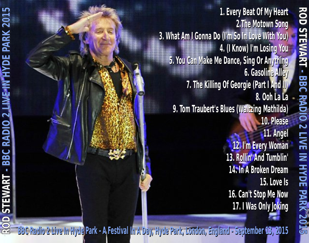 Label : no label Venue : BBC Radio 2 Live In Hyde Park "A Festival In A Day", Hyde Park, London, UK Recording Date : September 13, 2015 Length : 79:02 Quality : FM Recording (A+) Concert Review (The Guardian) : The biggest danger to health as Rod Stewart closes BBC Radio 2’s “festival in a day” in central London isn’t any of the singer’s old vices, such as riotous behaviour and blizzards of cocaine. Instead, it’s the risk of broken limbs from people tripping over an Ikea’s worth of garden furniture that litters the park and is invisible in the darkness. It’s a curious event – Stewart is preceded by the Corrs, Bryan Adams and a DJ set from Giorgio Moroder (in a backwards baseball cap), that he keeps interrupting with short anecdotes – made even more curious by Stewart’s choice of set. Instead of his usual, slightly tired arena set of singalongs, he promises to showcase less familiar material. Given that he has been a global superstar for 45 years, the concept of “less familiar” is relative, but the result is fabulous. There’s no Baby Jane or Sailing or Da Ya Think I’m Sexy. But there is a wonderful run that encompasses (I Know) I’m Losing You, the Faces’ You Can Make Me Dance, Sing or Anything, Gasoline Alley, The Killing of Georgie (Parts I and II) and a song introduced as Stewart’s favourite of those Ronnie Lane wrote for the Faces, Ooh La La. Later on, he throws in his version of Jimi Hendrix’s Angel and, magnificently, the Python Lee Jackson hit In a Broken Dream. Stewart’s voice, although less fragile than on his 2013 tour, isn’t what it once was – he is 70, after all – and there are a couple of moments when his pitch sounds approximate. For the most part, however, he hits the notes he needs to – ascending into a falsetto, and summoning enough power when the song calls for it. It’s a show that leaves you wondering quite how brilliant Stewart might be if he would dispense entirely with the Hollywood material and do something similar in theatres. But for a festival show from an MOR superstar, this is special stuff. Concert Review (The Standard) : Now in its fifth year, Live In Hyde Park has become the almost-official closer to the outdoor concert season. For the BBC, it offers the double whammy of relentlessly promoting its output and showcasing Radio 2, Britain’s most popular radio station. Its 55,000 tickets all sold, but while 2014 had the shock and awe of Jeff Lynne fronting Electric Light Orchestra, 2015’s jawdropper-free line-up was more ho-hum and humdrum, and the first and second on the bill are both in their eighth decade. Normally the safest of bets, Rod Stewart fled his comfort zone. “This isn’t a normal Rod Stewart concert,” he explained. “We won’t be playing Sailing, Maggie May, Do Ya Think I’m Sexy or Baby Jane. I wanted to make tonight special.” So the 70-year-old mostly dipped into his solo and Faces back catalogue for the rarely played Gasoline Alley, Tom Traubert’s Blues and Ooh La La, while his former guitarist and co-writer Jim Cregan guested on the curtailed closer I Was Only Joking. Those in a crowd, which included Scotland manager Gordon Strachan, weatherwoman Carol Kirkwood, Kaiser Chief Ricky Wilson and swimmer Mark Foster, who wanted a standard Stewart singalong were dismayed, but not being able to coast galvanised Stewart’s performance and The Killing Of Georgie was sensational. Concert Review (The Telegraph) : Last month Rod Stewart’s wife Penny Lancaster controversially claimed that the 70-year-old rocker will from now on be wearing looser trousers in order to aid the conception of a second child. But the 55,000-strong crowd at his Hyde Park gig bore witness to the falsity of this statement: old snake-hips emerged in skin-tight leather trousers. After an afternoon of tame pop and soft rock from the likes of Will Young and Leona Lewis, we were treated to an energetic headline set covering recent material alongside rarely-played classics from Stewart's early career. Stewart made a name for himself in the Sixties, playing in a number of groups while beginning a solo career that would run alongside his band work. He kept up this dual approach even when he achieved fame as part of The Jeff Beck Group and Faces, with whom he played just last week at the Hurtwood Park Polo Club after a 40-year absence. His smoothly ragged vocals, drenched in R&B and soul, nonetheless anticipated heavy rock and metal. He has released 62 singles and sold 100 million albums. The flamboyant old ways of Rod the god were certainly in evidence, with the singer shaking his knees and sliding across the stage between vocal sections, but there were also subtly contemporary takes on his oeuvre. 1970’s Gasoline Alley is naturally folksy, but in an American blues mould: here it was bolstered by strings and a double bass, which gave it the flavour of the festival folk pop the likes of Mumford & Sons have made popular over the last few years. Performances of Faces classics such as I’m Losing You and You Can Make Me Dance had those members of the audience who had remained sitting on their picnic blankets up on their feet. New tracks, too, though slight as songs, were valuable in showing what the older singer can do. Please, from Stewart’s forthcoming album Another Country, gave him a chance to hit clear high notes. The set no doubt appealed to die-hard fans. Faces track Angel hadn’t been played live since 1976. Other songs Stewart put in the vague past, as having “not been played since 1960-something-or-other”. Ever the troublemaker, Stewart crowned a performance of 1976’s The Killing of Georgie by berating his hosts at Radio 2: “That was a controversial song when it came out because it dealt with homosexuality. The BBC refused to play it. And look where I am now.” Later in the set he’d take another swipe at the broadcasters for curtailing his set time. Yet Stewart knew the time he had to play with, and i