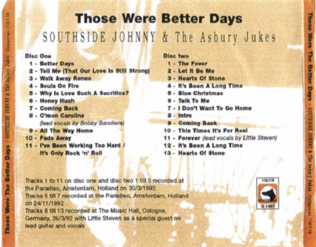 Review : Nice bootleg released on the Doberman label. Excellent sound ! The bonus tracks are taken from the Paradiso, Amsterdam, November 24, 1992 (tracks 5-7) and from The Music Hall, Cologne, Germany, March 26, 1992 (tracks 8-13) with Little Steven on lead guitar and vocals. |