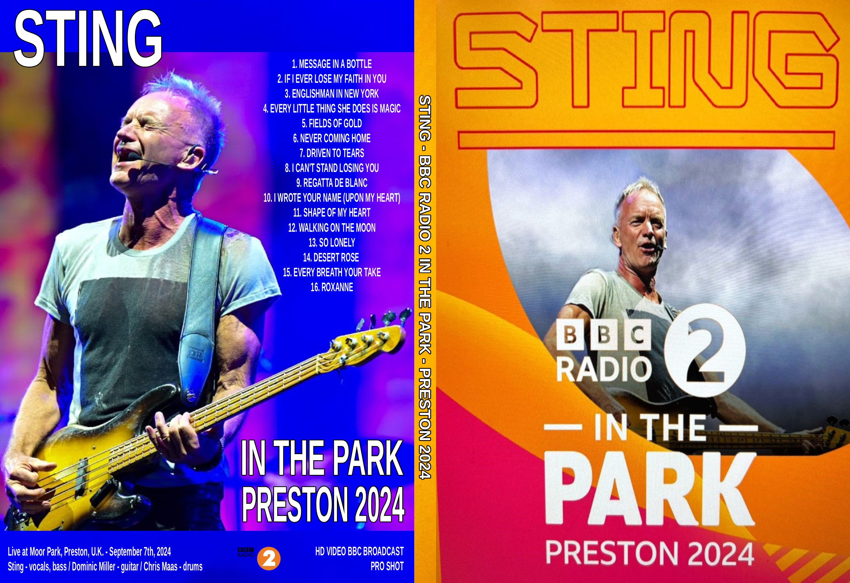 Label : no label Venue : Moor Park, Preston, UK Recording Date : September 7, 2024 Length : 115 minutes NTSC : 16:9 Concert Review (At The Barrier) : The first headline slot of the weekend came from the legendary Sting. No time was wasted at all with the set opening with The Police’s classic Message In A Bottle to an overwhelming crowd reaction. The set continued to wow the audience going from classic to classic scouring the discographies of not only The Police but of Sting’s solo material. The band accompanying Sting was truly fantastic, however a special mention has to go to the drummer who was absolutely relentless throughout the entire set. The overall highlight had to be So Lonely, The Police’s classic which generated the most amount of dancing and moving seen all day at the festival. Sting put on a brilliant live show which was a great way to close the first day. |