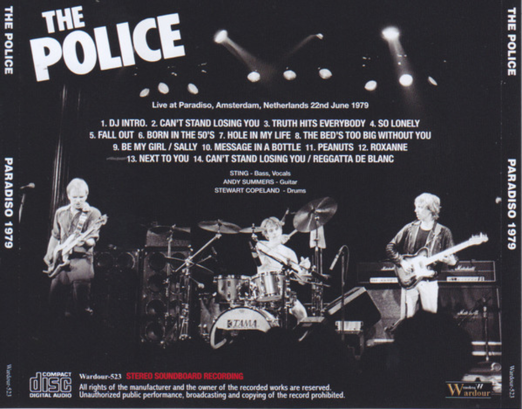 Label : Wardour Venue : Paradiso, Amsterdam, The Netherlands Recording Date : June 22, 1979 Length : 60:16 Quality : FM Recording (A+) Review : Op 22 juni 1979 gaf The Police een concert in de Grote Zaal van het Paradiso in Amsterdam. Het optreden werd destijds uitgezonden op NPO Radio 2 als onderdeel van het jaarlijkse Zomer Festival. Het concert vond plaats in een cruciale periode voor de band. Ze hadden hun debuutalbum Outlandos d'Amour in november 1978 uitgebracht en werkten aan hun tweede album, Reggatta de Blanc. De setlist bevatte dan ook nummers van beide albums, wat het een interessante momentopname maakt van hun muzikale ontwikkeling. De setlist van het concert bevatte een mix van vroege hits en nummers die nog moesten uitkomen. Van het concert bestaan geluidsopnamen, die als bootleg-opnames circuleren en beschikbaar zijn op platforms zoals YouTube en het Internet Archive. De radio-uitzending zorgde voor opnamen van een relatief hoge kwaliteit voor die tijd. |
